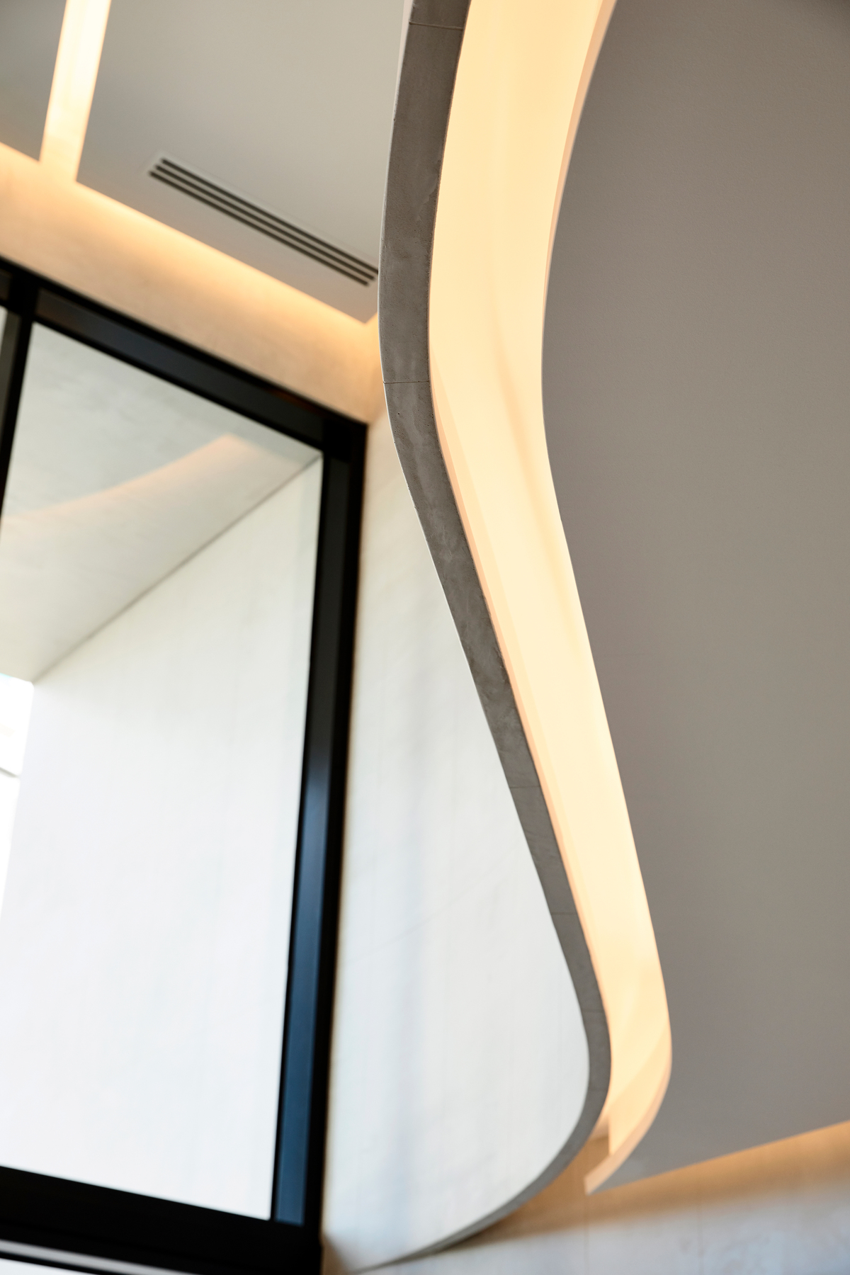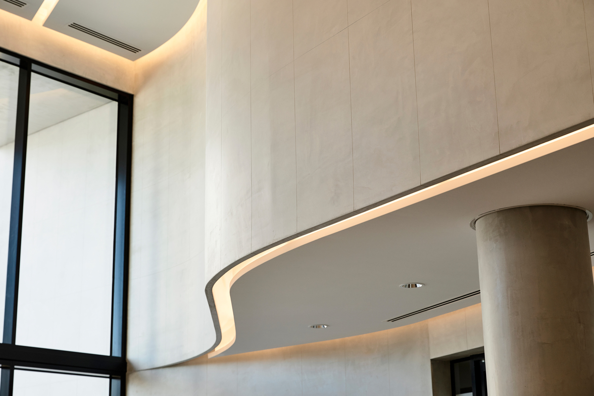 A subtle change in building shape is represented with a simple crease which evolves into a curved corner form which creates a restrained elegance to the building.