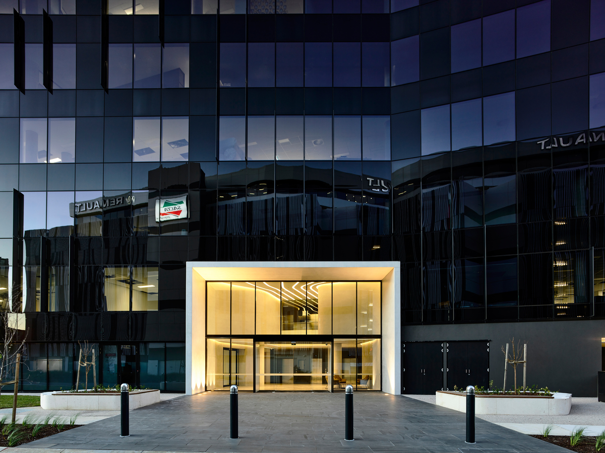 The south frontage provides an elegant dark curtain wall facade where the building has its entry.