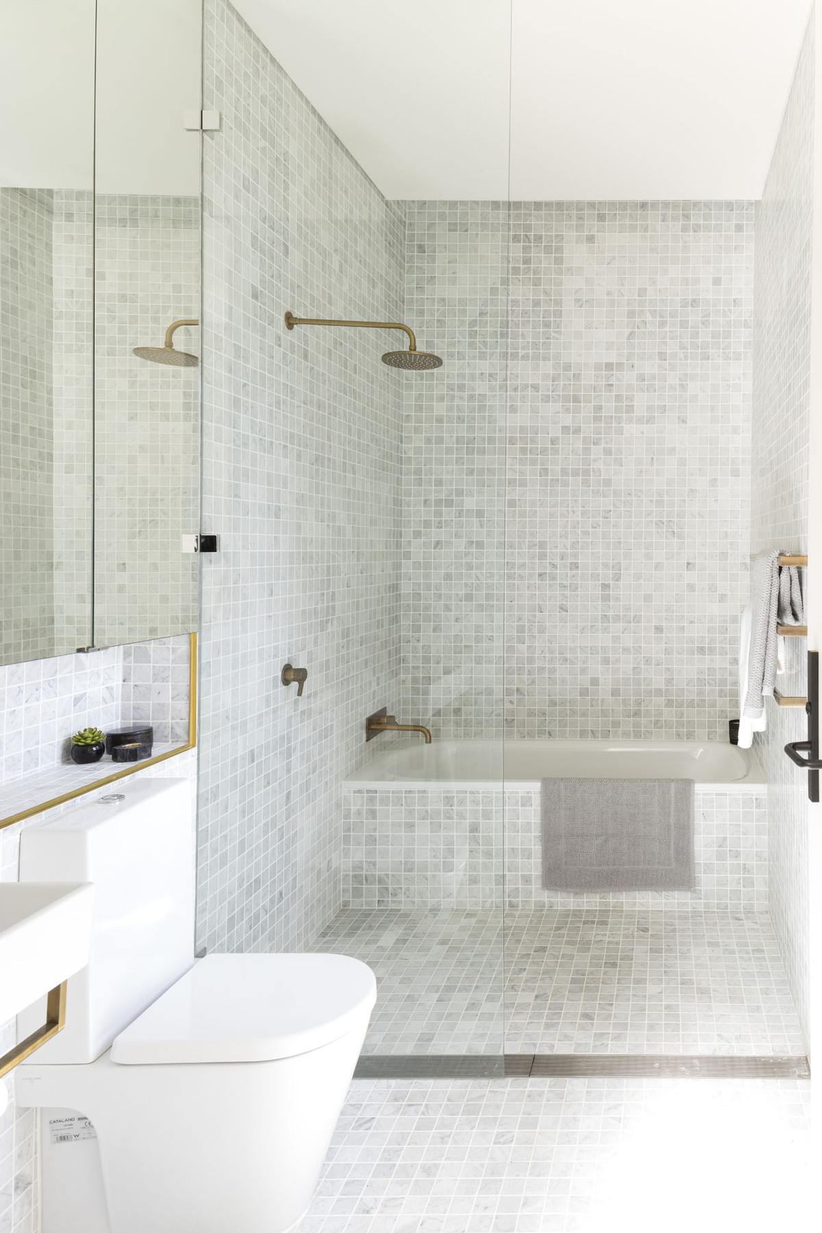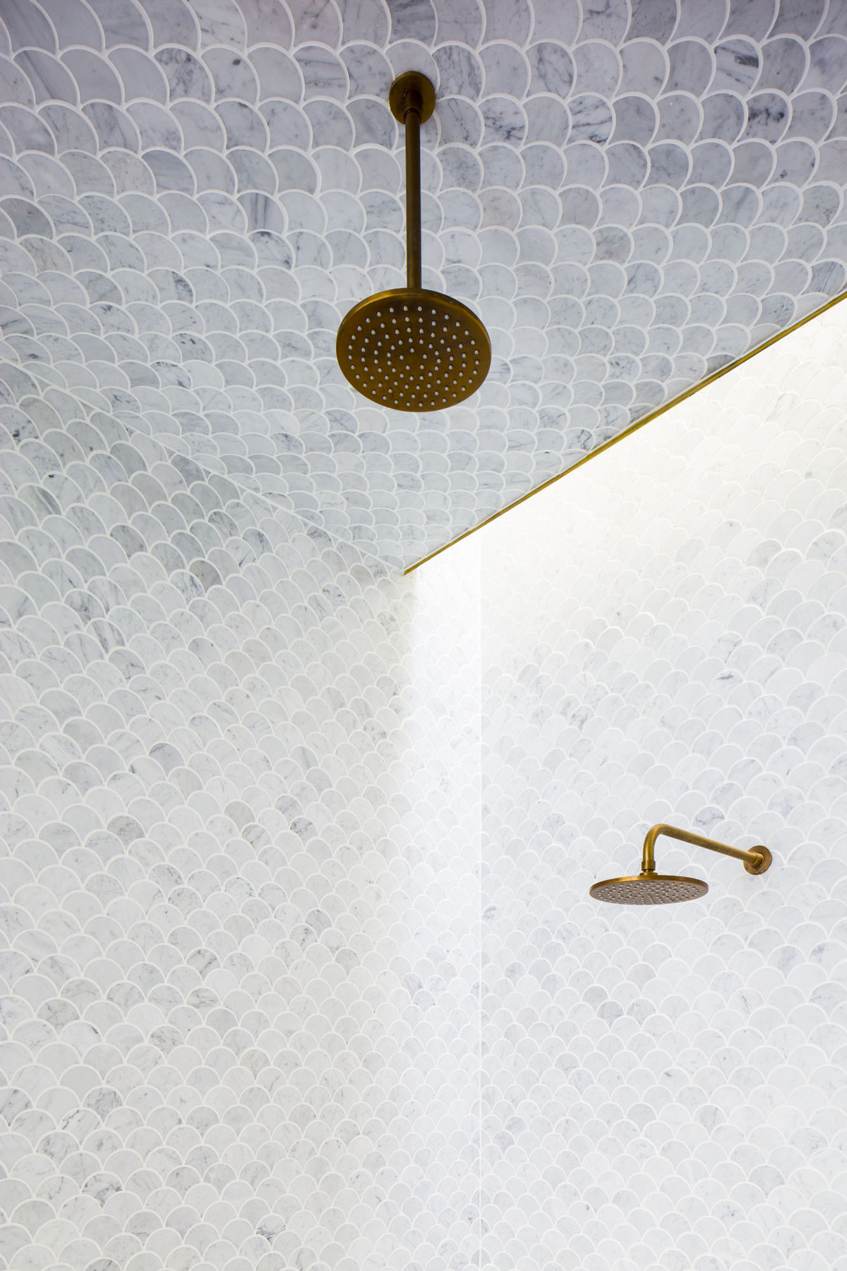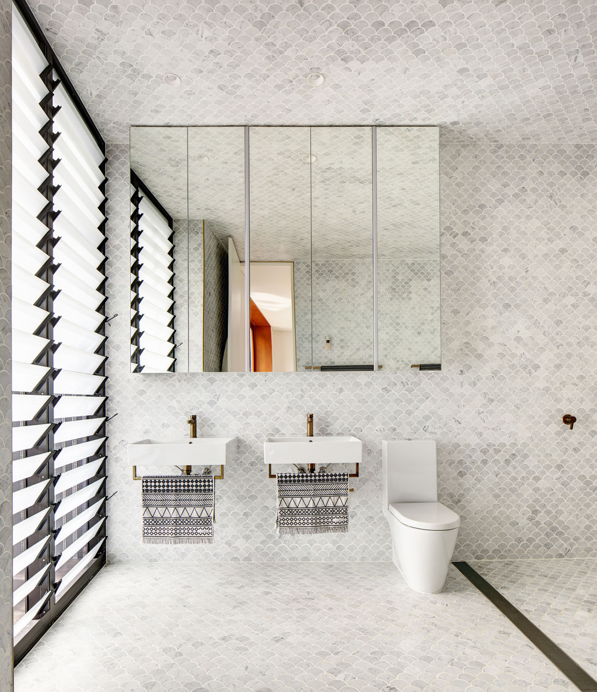 The motif of natural materials continues, the main bedroom ensuites tall walls clad with gorgeous light grey fan tiles, perfectly complimented by patinated brass fixtures.