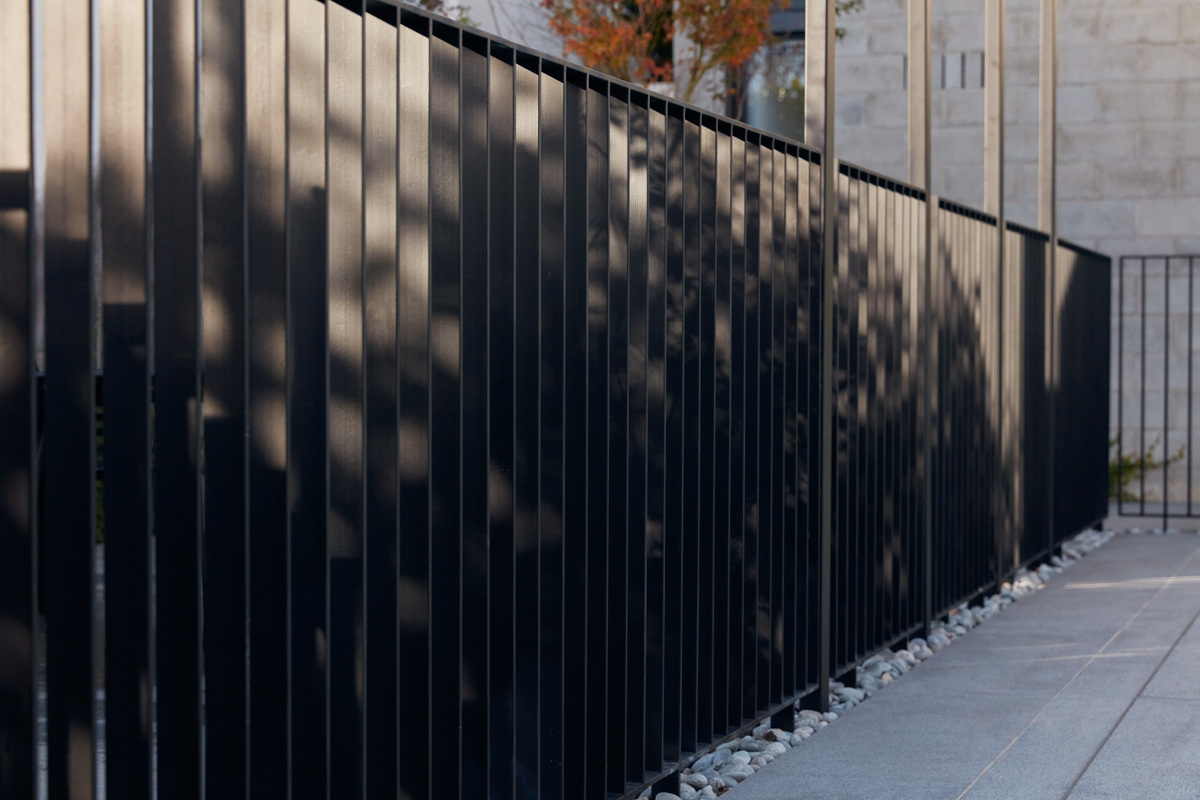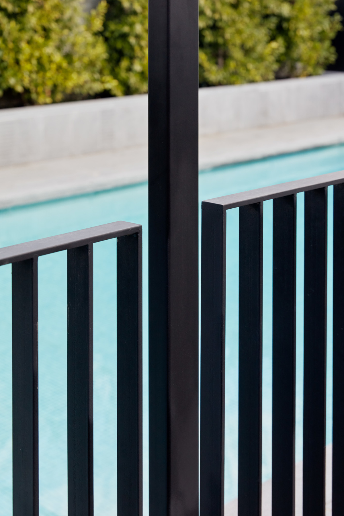 Public Realm Lab created a series of bespoke elements that did many jobs – the pool fence included bespoke lighting that gently defined places to sit and also showed the way to the front door.
