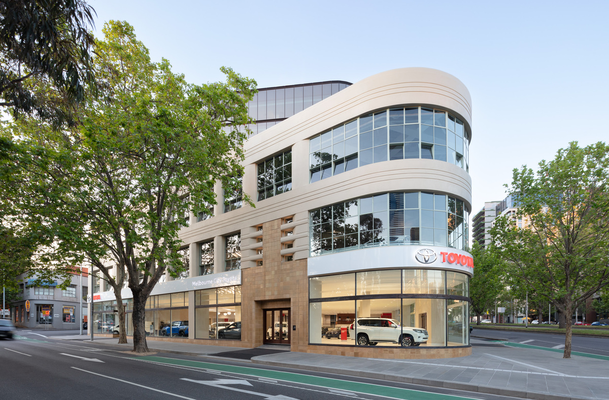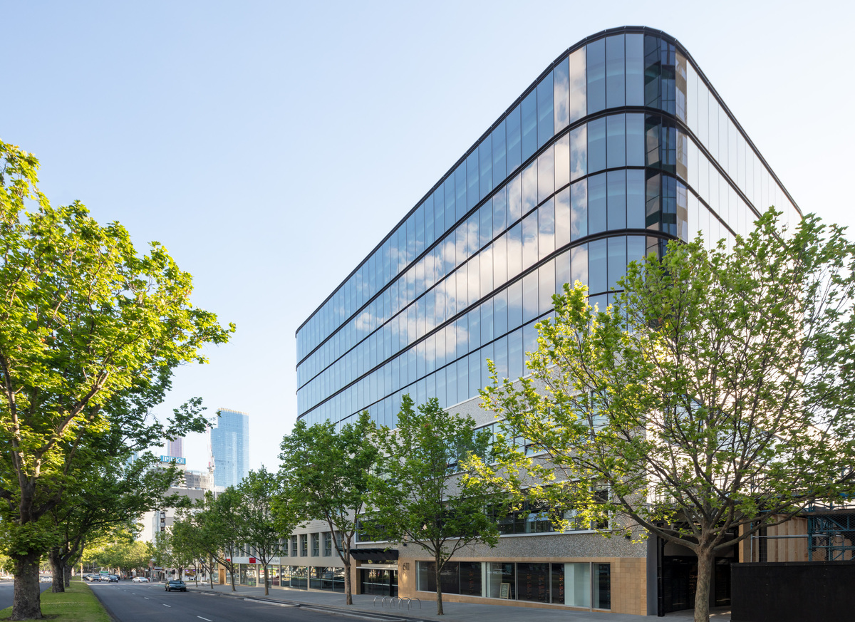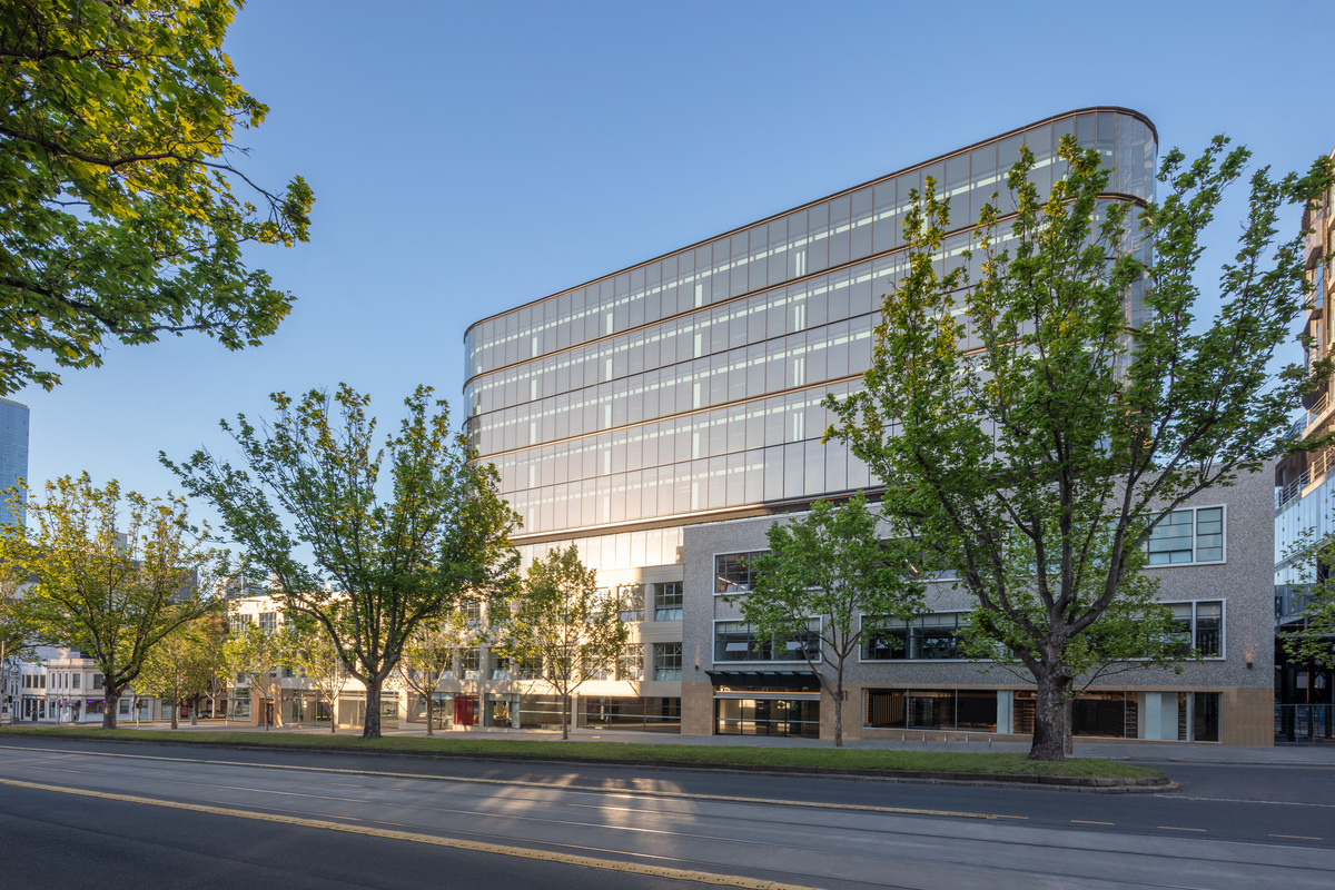 The curved corners of the office building soften the visual impact of the new form that sits above the existing heritage building and is sympathetic to the corner of Elizabeth and Queensberry Streets below.