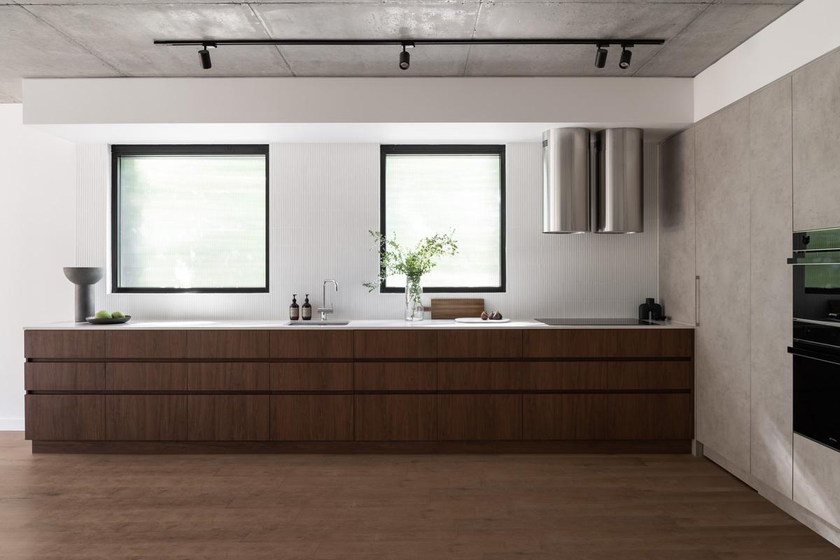 With a material palette that draws from the surrounding context (concrete, brick, and timber), the primary street façade is separated into four bays.