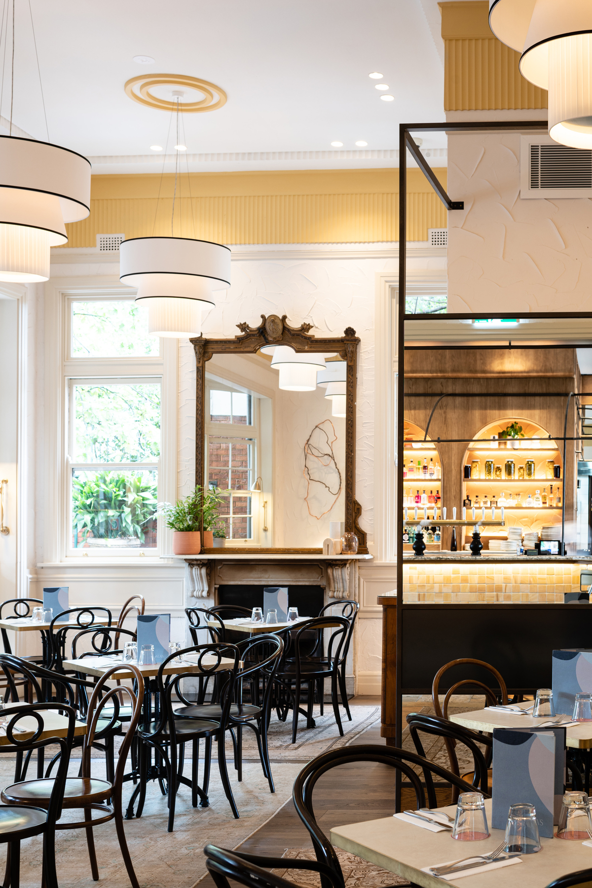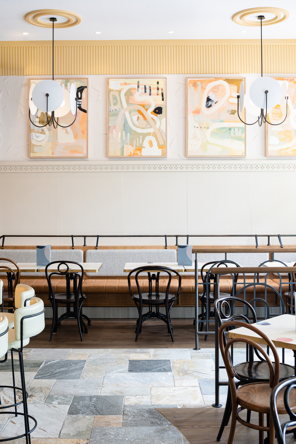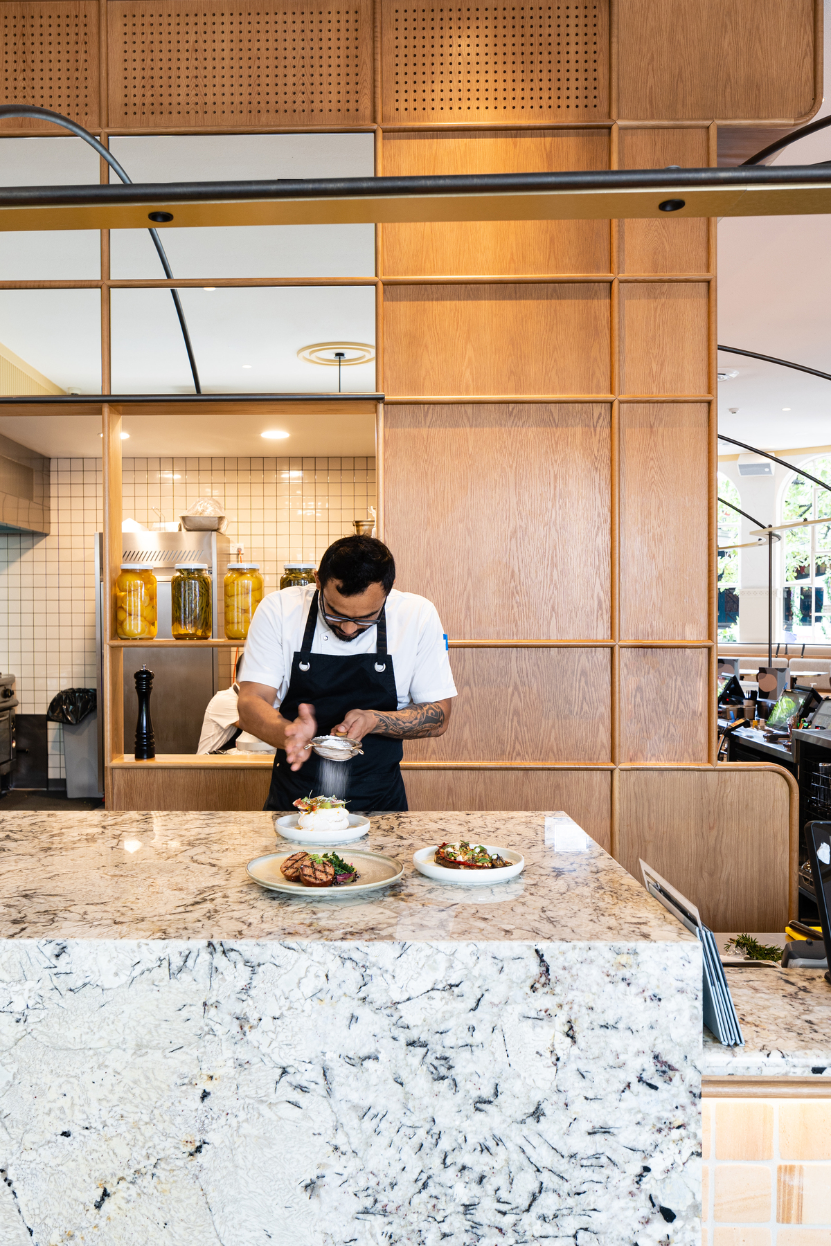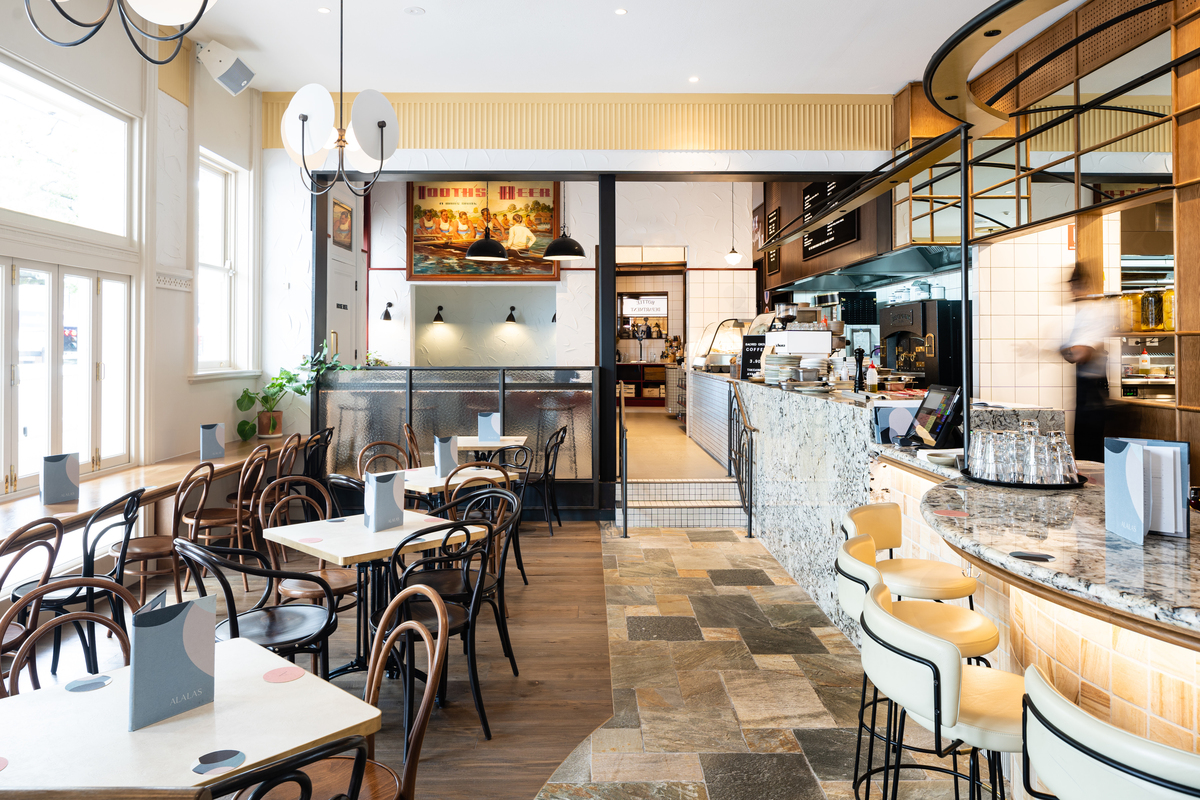 Bathed in natural light via huge windows, the new space with interiors designed by Pony Design Co. features warm timber and marble tabletops, accented by specially commissioned artwork.
