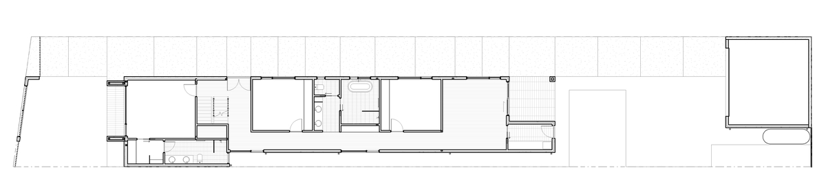 To capture views at the narrow end of the site from this new two-storey house, Ply Architecture introduced wide expanses of glass framed by structural elements open to the west.