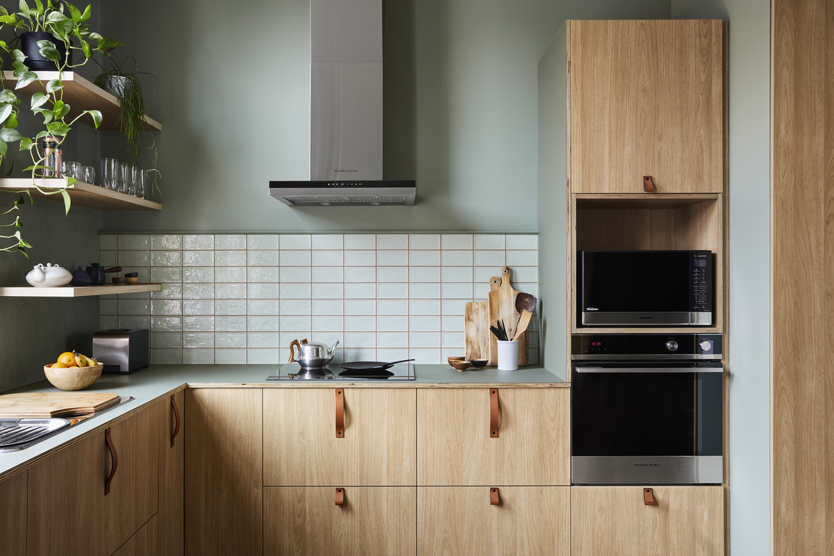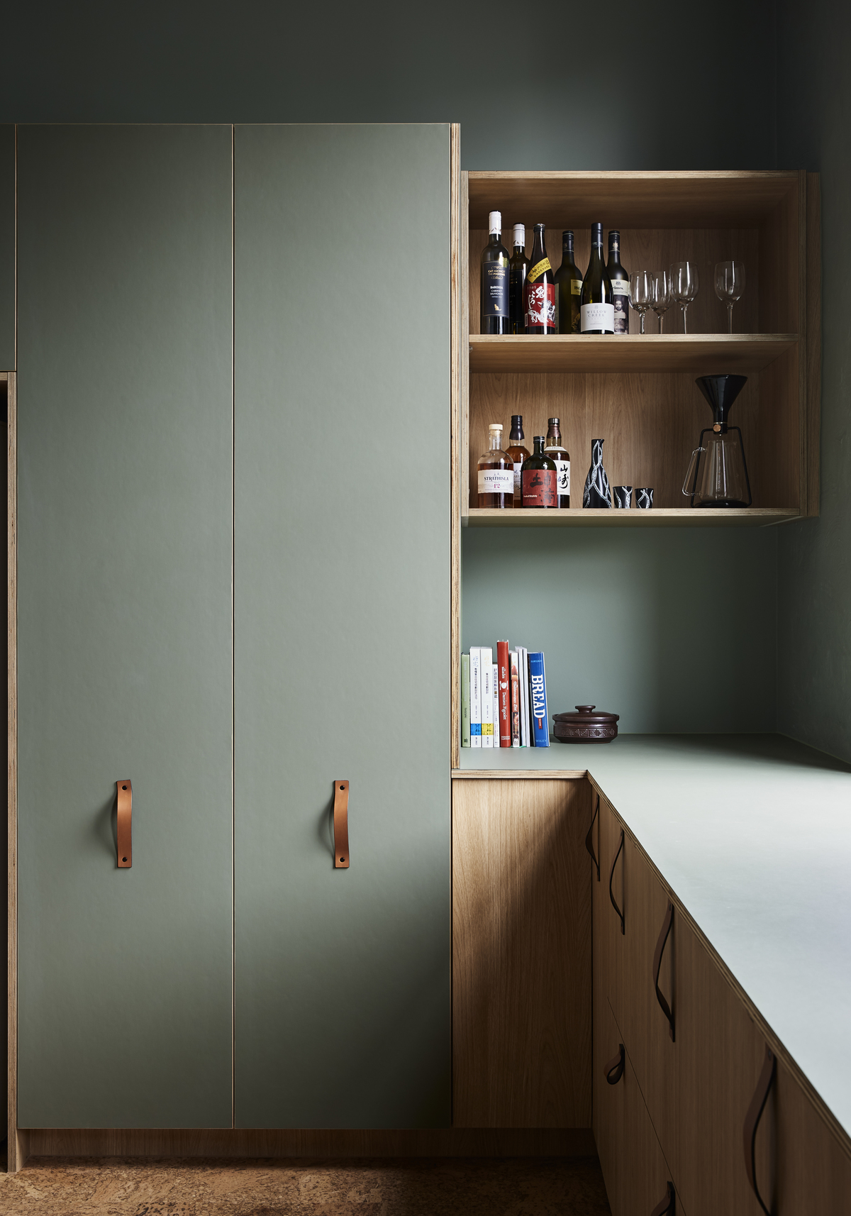Warmth defines the new kitchen and living space, where timber shelving and cork flooring sit well with the new heating.