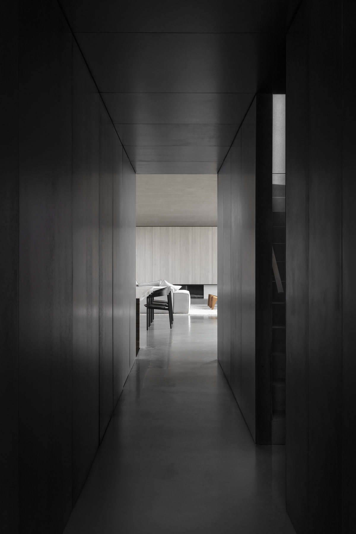 The ‘journey’ through this dark corridor with a lower 2.4mH ceiling (to facilitate the master bedroom mezzanine above), creates a sense of compression for the user, before a sense of release when walking towards the living room where, the line of sight is funnelled forward to where the gable opens up into the main space.