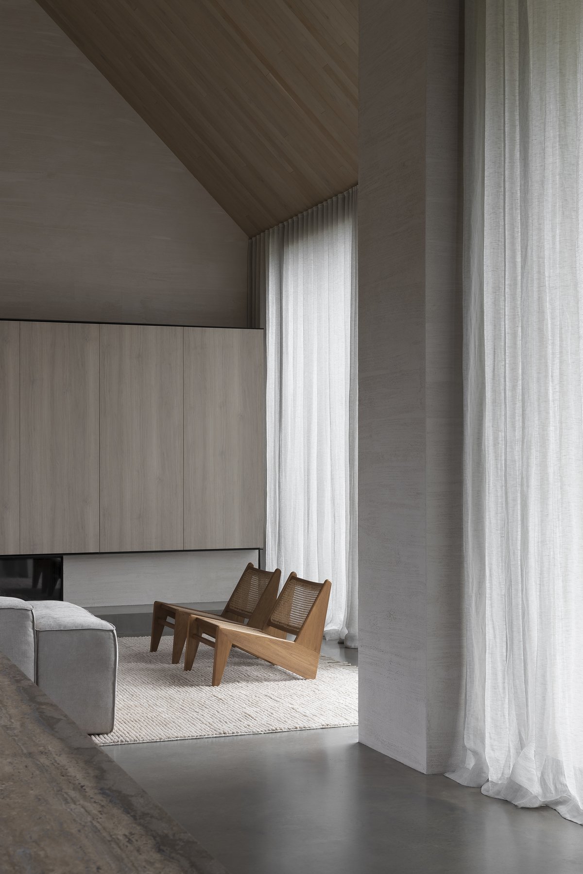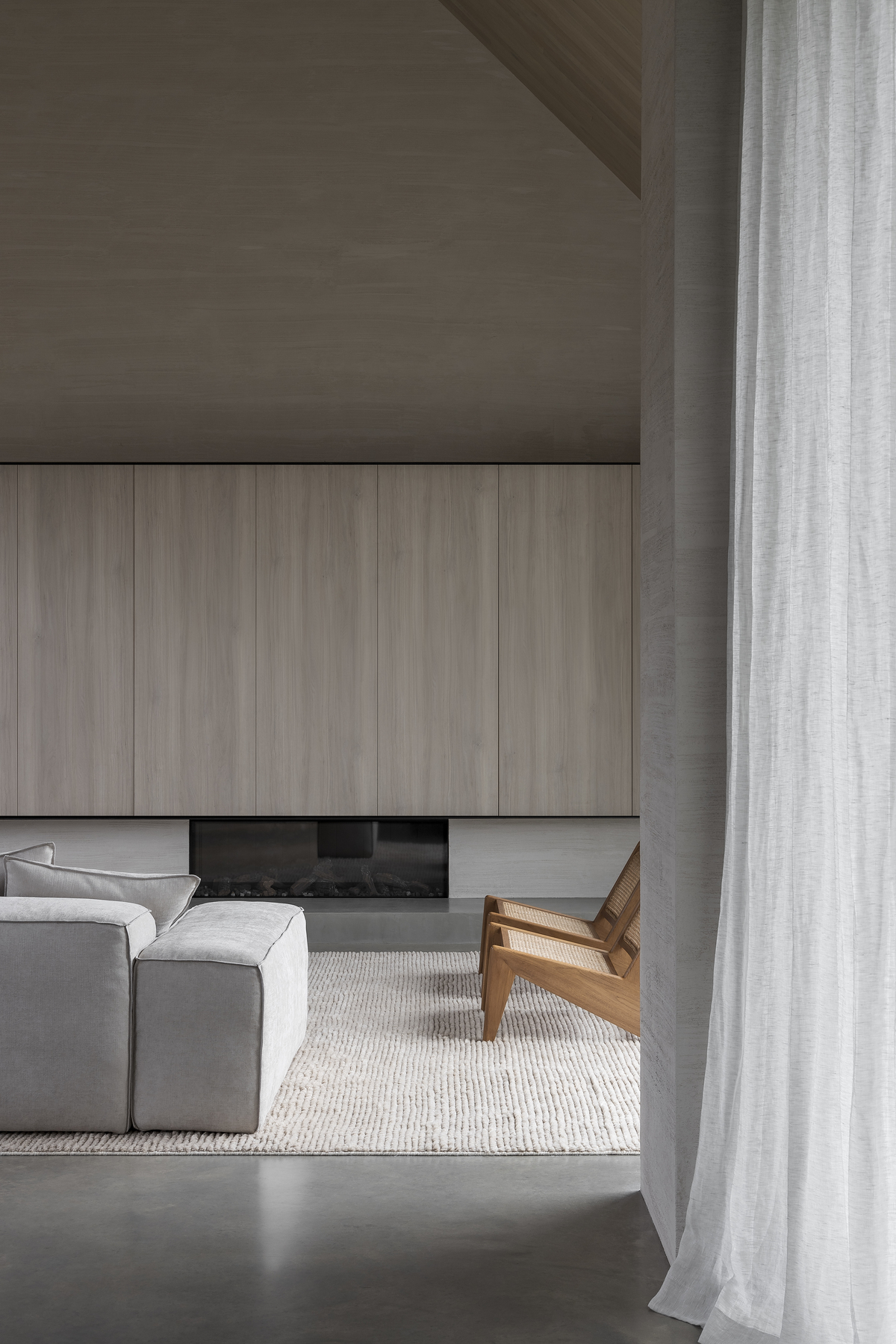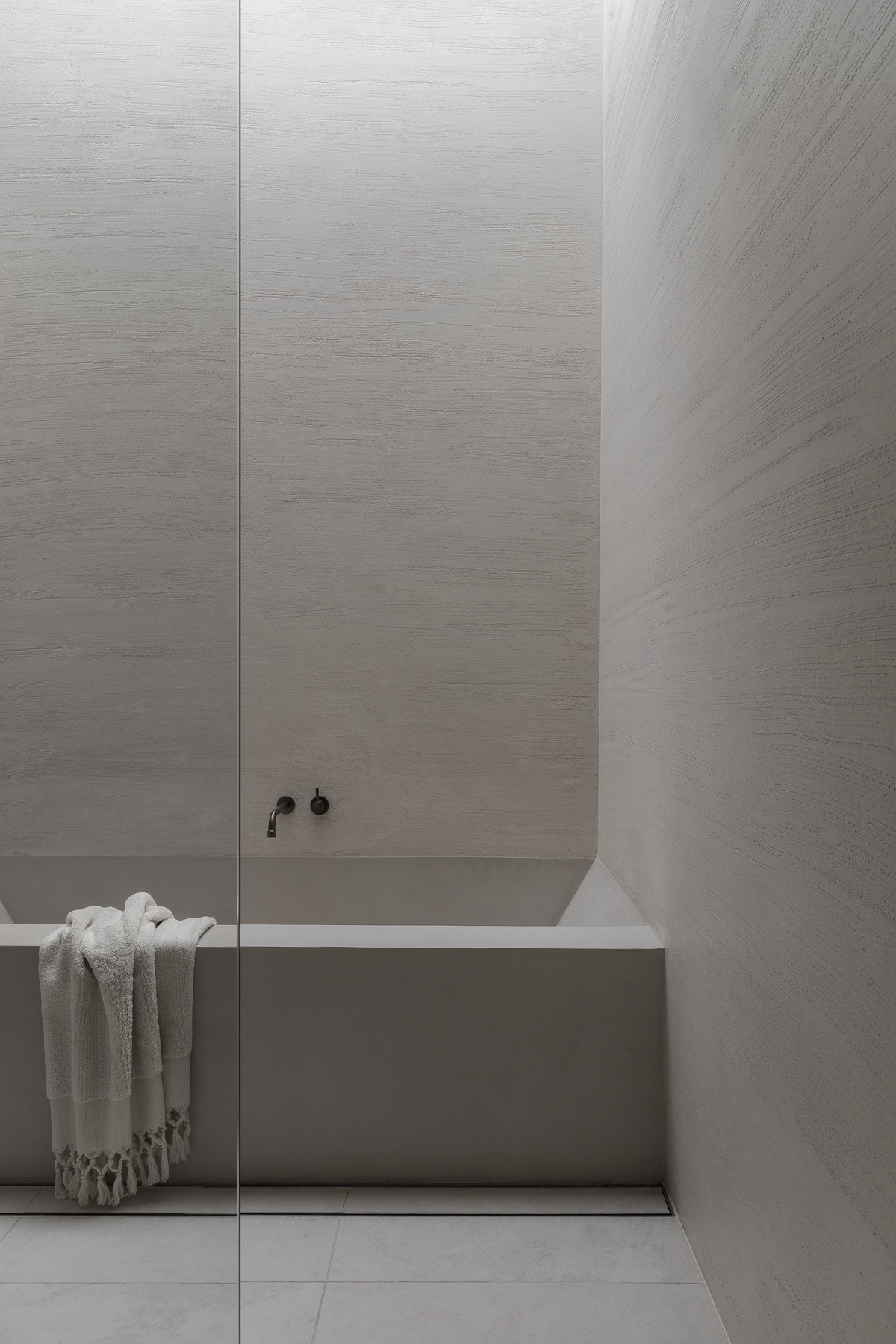 Complementing the de-saturated timber ceilings and joinery, slabs of silver travertine and burnished concrete floors are supplemented with hand-scratched solid plaster walls, in a soft, warm ‘bone’ colour. Linen sheer curtains softly balance the space, creating comfort and a sense of welcoming.