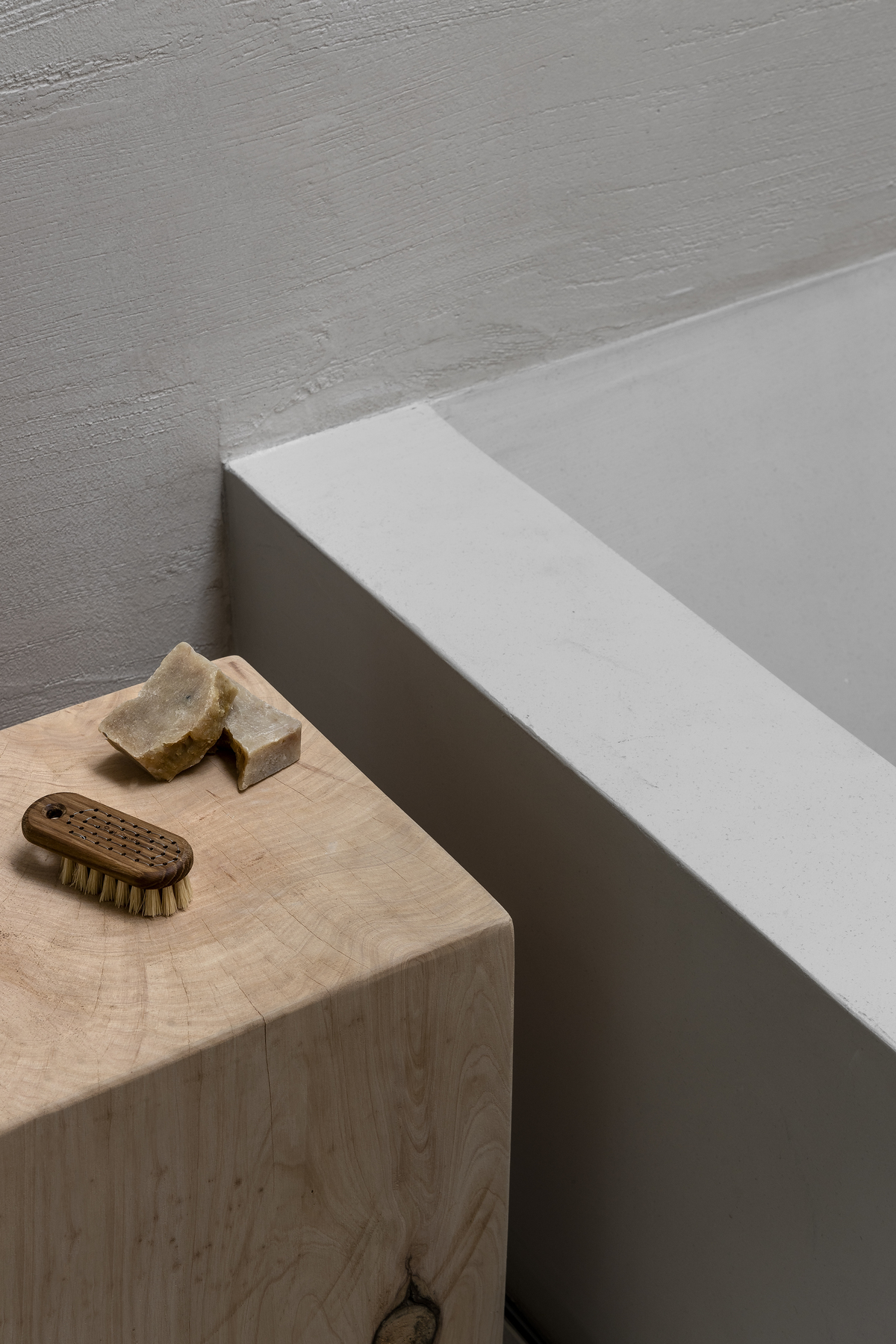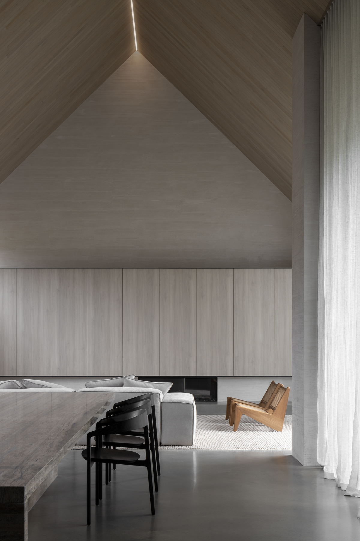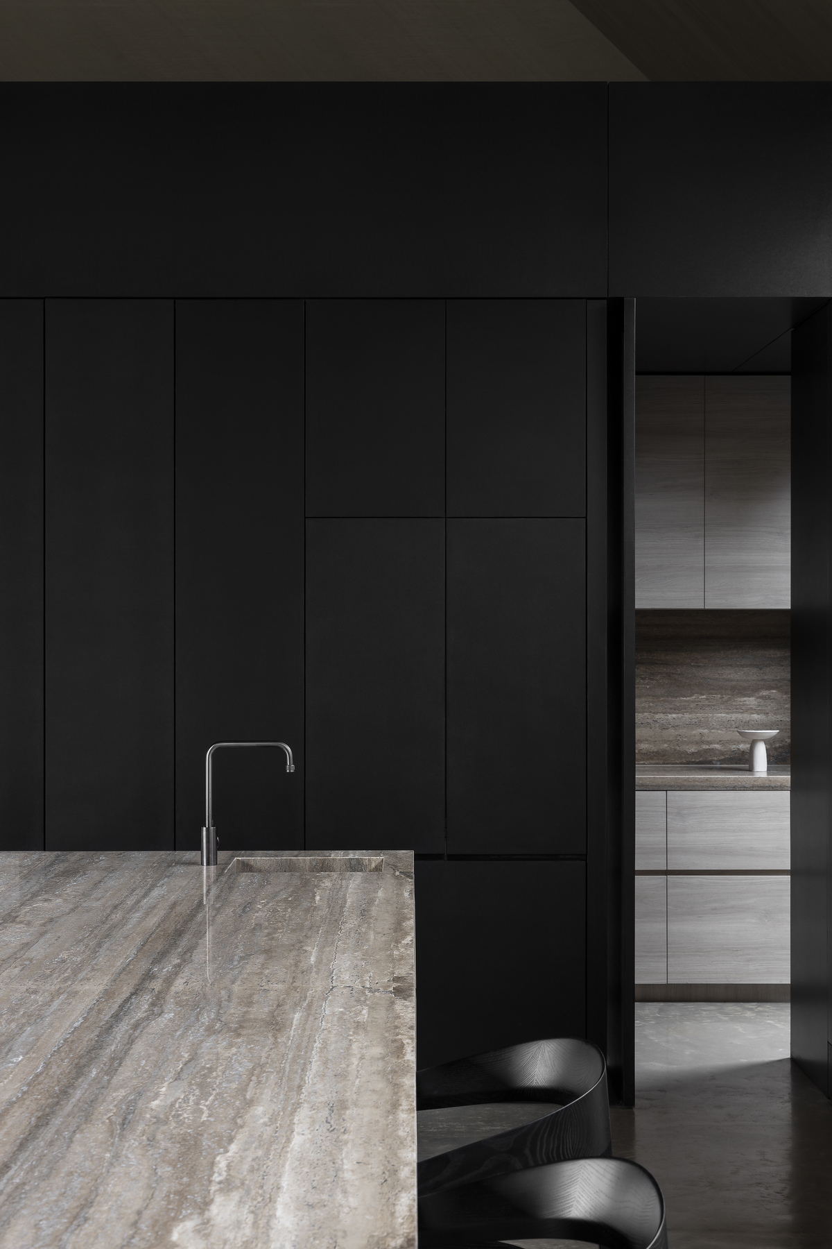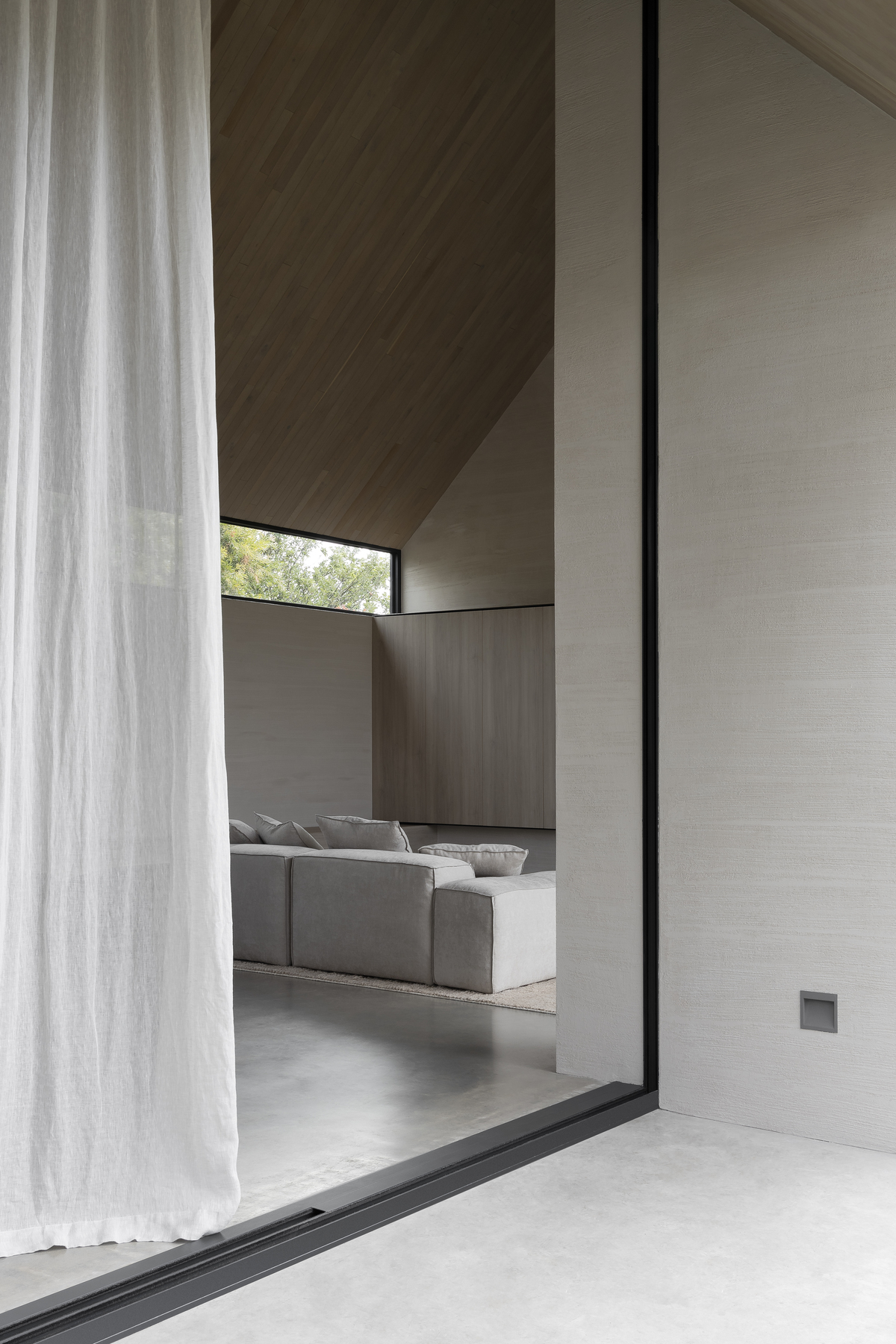 Complementing the de-saturated timber ceilings and joinery, slabs of silver travertine and burnished concrete floors are supplemented with hand-scratched solid plaster walls, in a soft, warm ‘bone’ colour. Linen sheer curtains softly balance the space, creating comfort and a sense of welcoming.