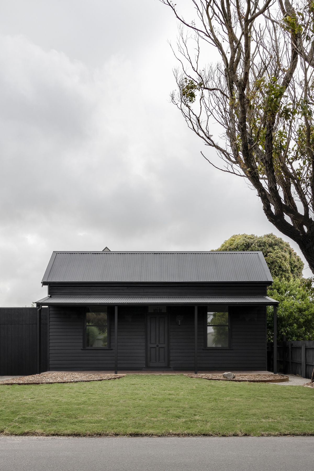 The striking black colour stands out against the textured foliage of the surrounding landscape, enabling the heritage cottage to sit proudly centred in the front yard.