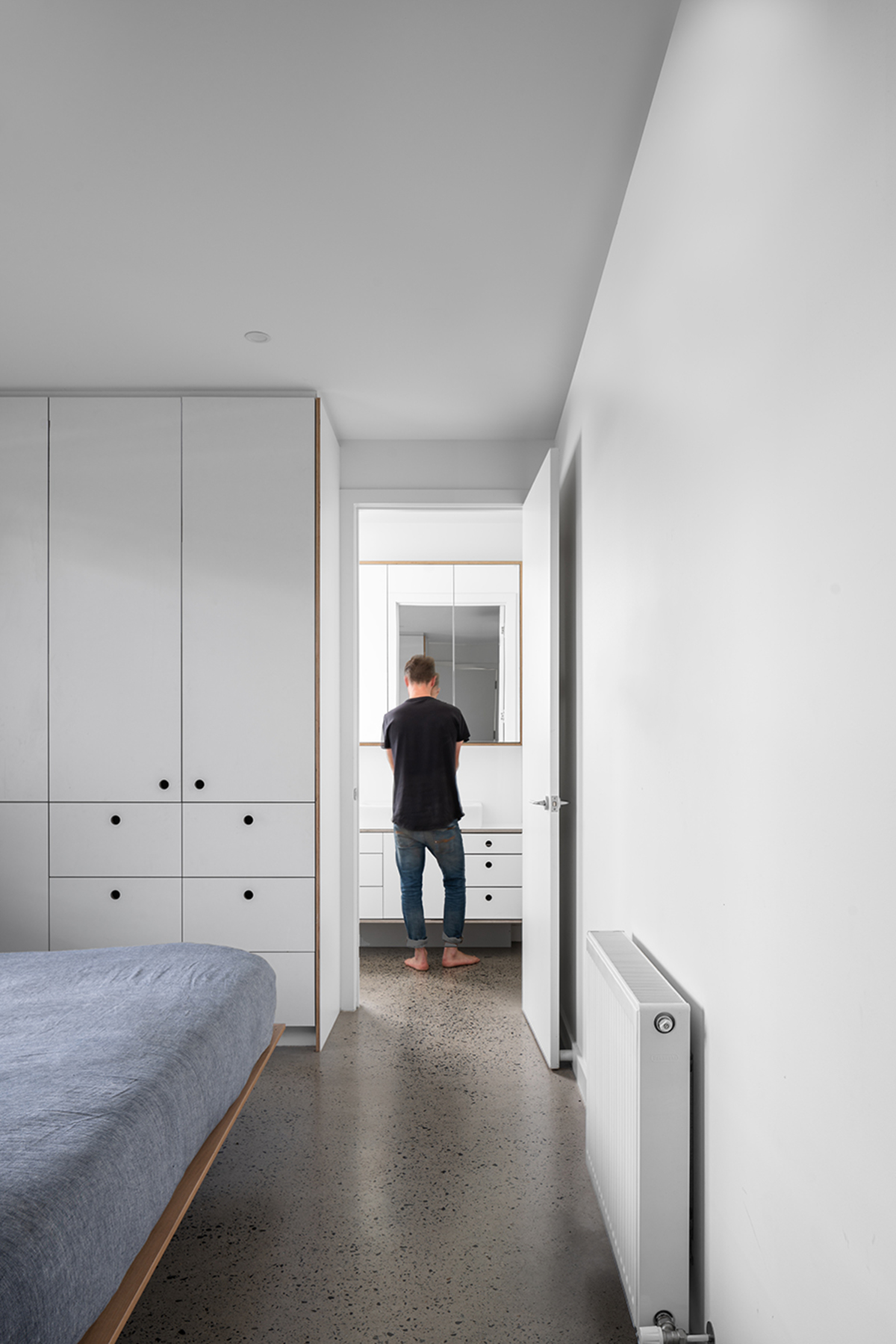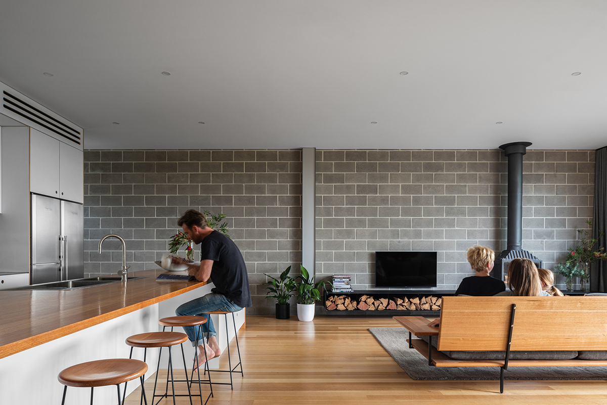 Inside besser block concrete walls are softened by polished timber floors, polished concrete and white minimalist joinery.