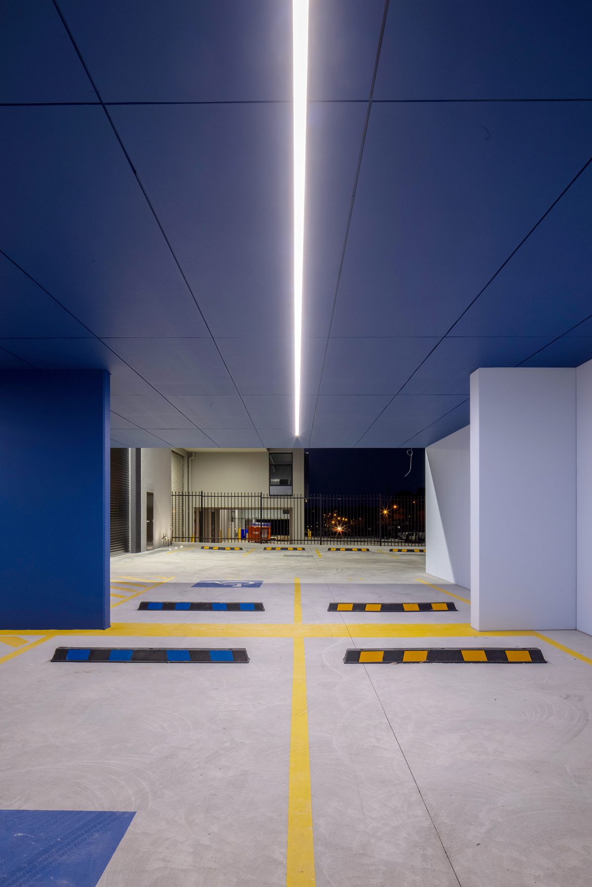 On the interior of the parking garage, a dark blue ceiling meets the clear glazing of the building’s facade.