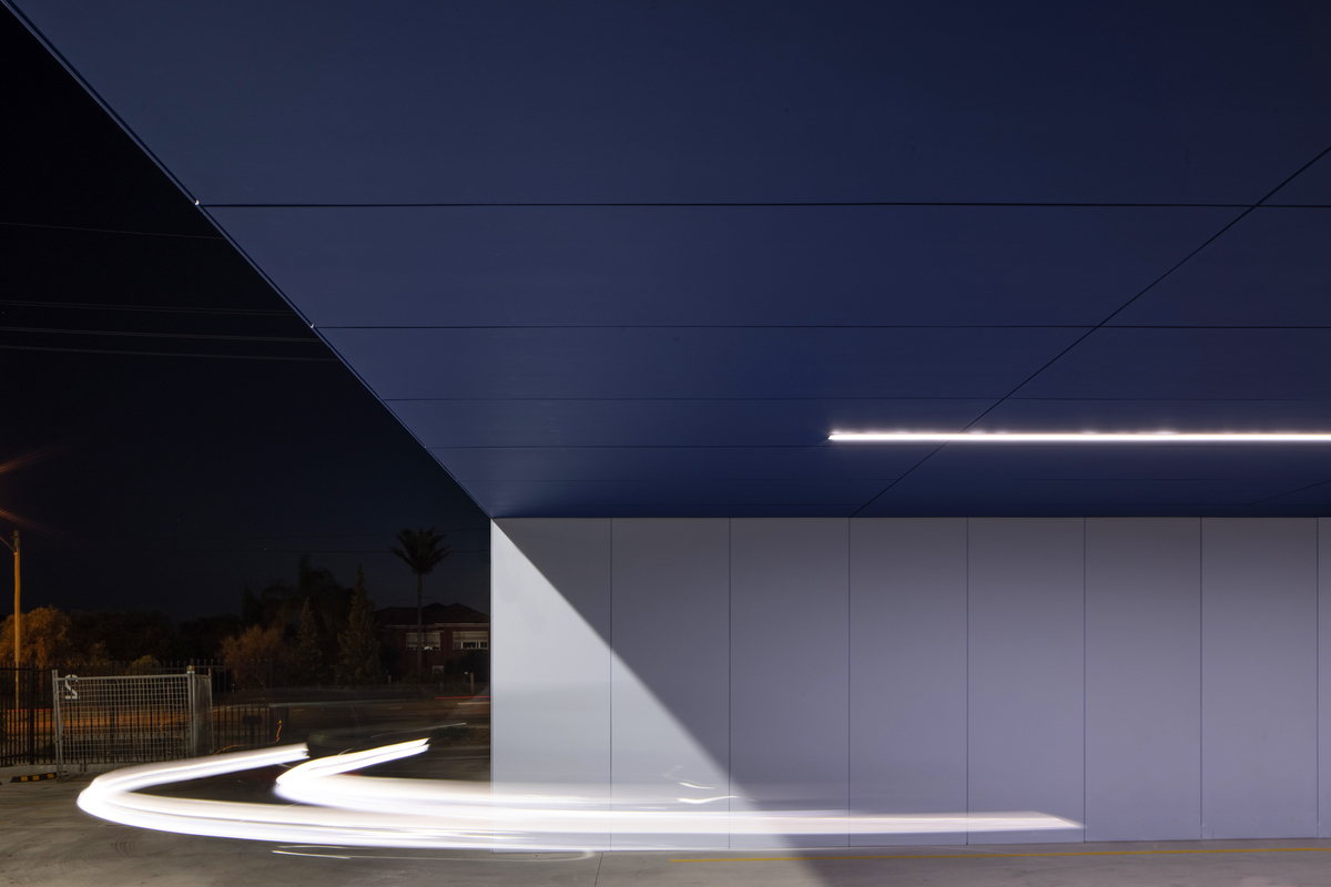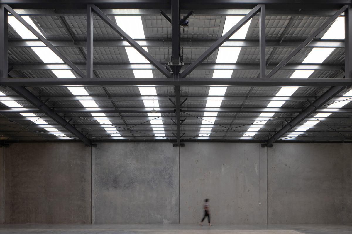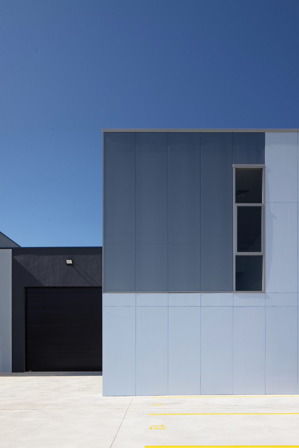 Designed by Fuse Architecture, Big Blue adopts and refines the standard functional warehouse plan of its neighbours through the practical uses of volume, colour, and material, ultimately shaping an asymmetrical structure that transforms across the course of a day.