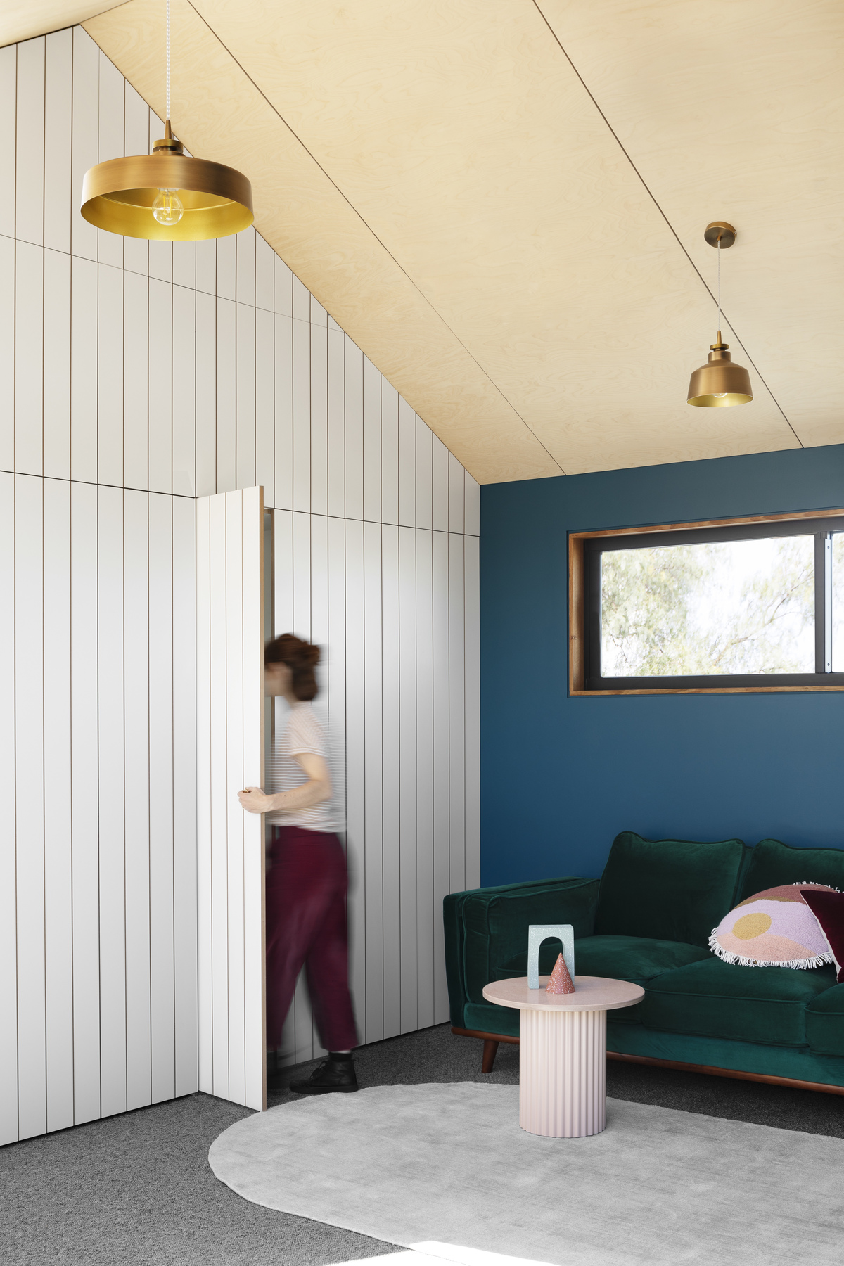 Blocks of blue contrast with ply ceilings, timber trims, and white joinery, while brass fittings provide a bit of bling.