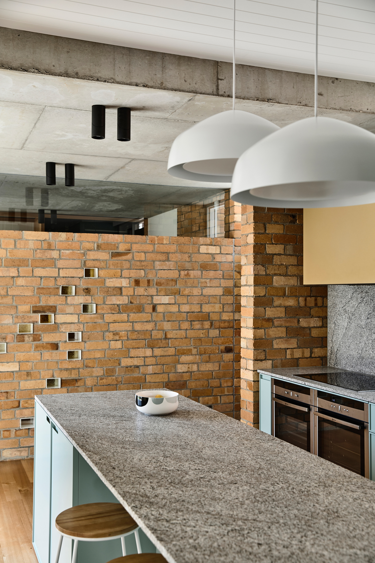 The Y Chandelier 04 in natural brass was selected for the dining area pendant fitting and Ora Pendant from Ross Gardam over the island bench.