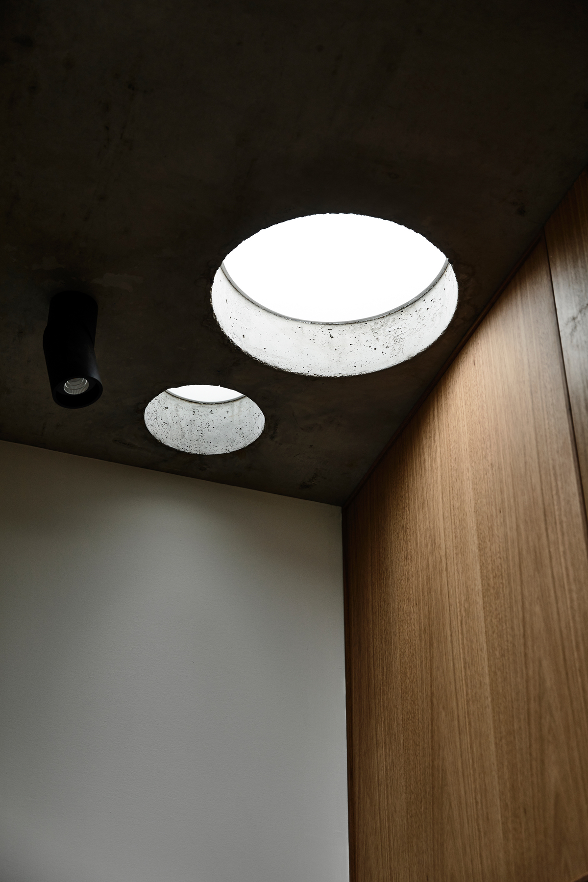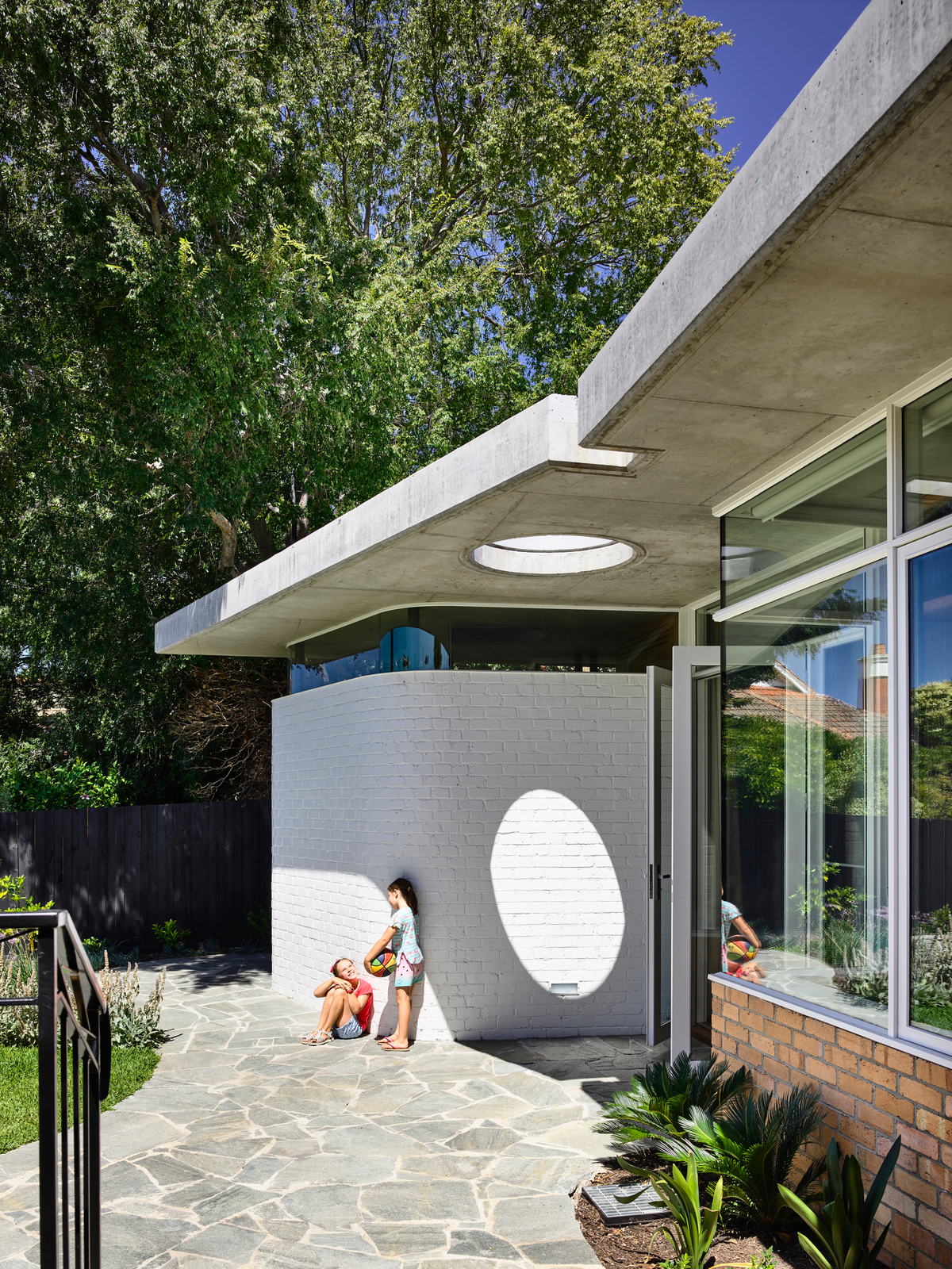 These walls are then capped with a large thin singular concrete roof that is exposed internally and slides under the existing houses eave line, clearly delineating old and new.