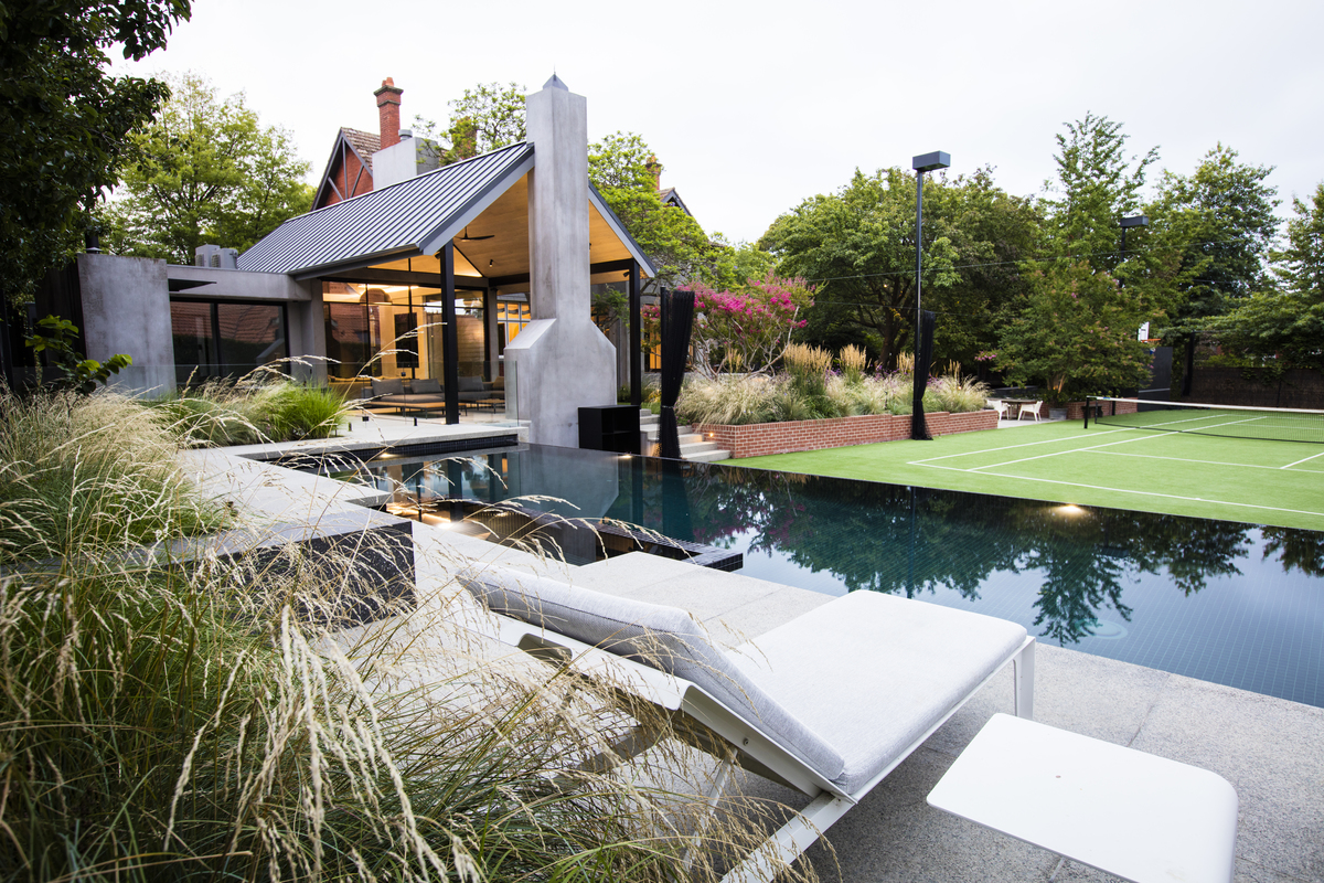 Steps were introduced to help manage the level changes between the grassed area, pool, and tennis court levels.