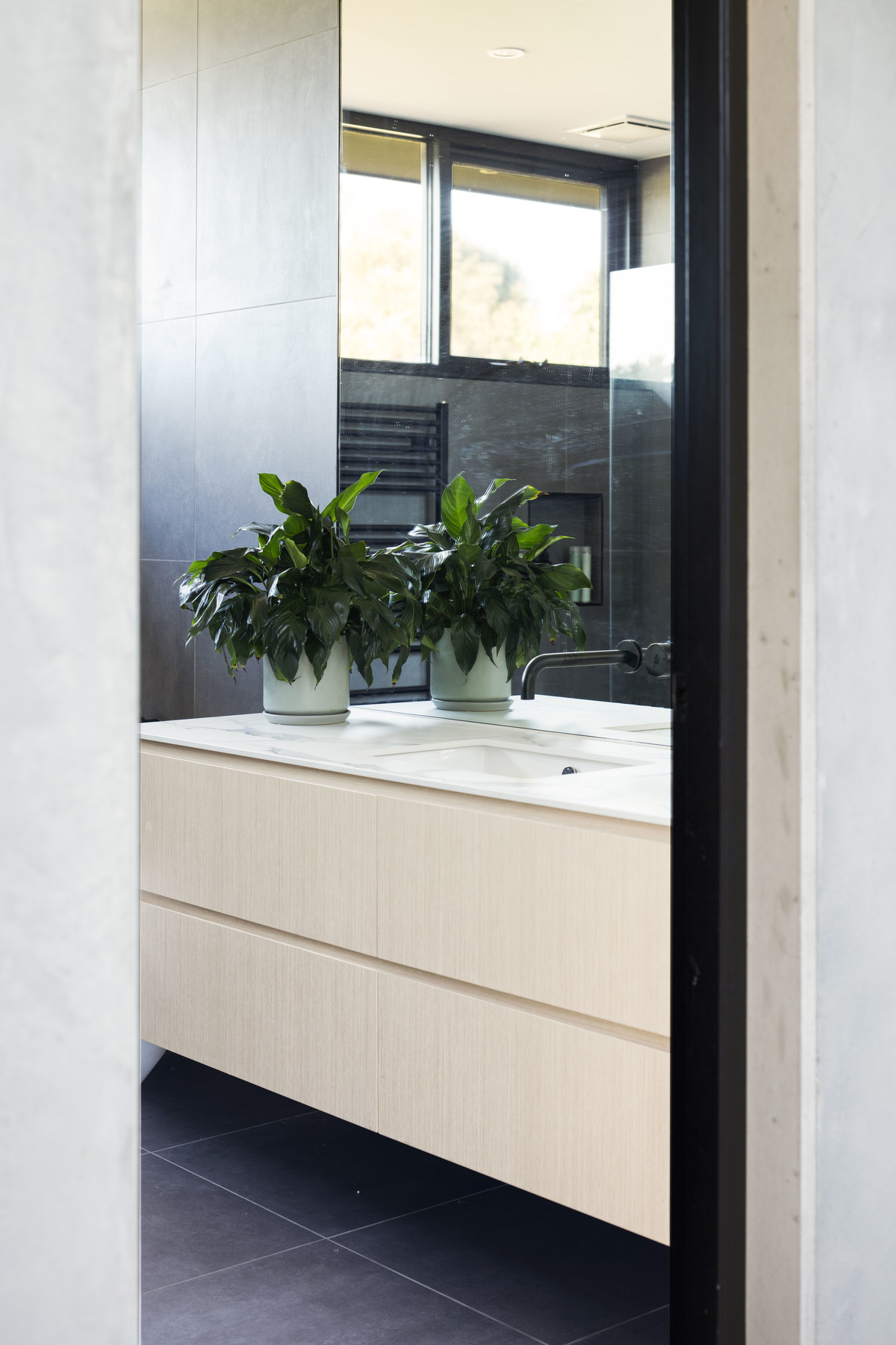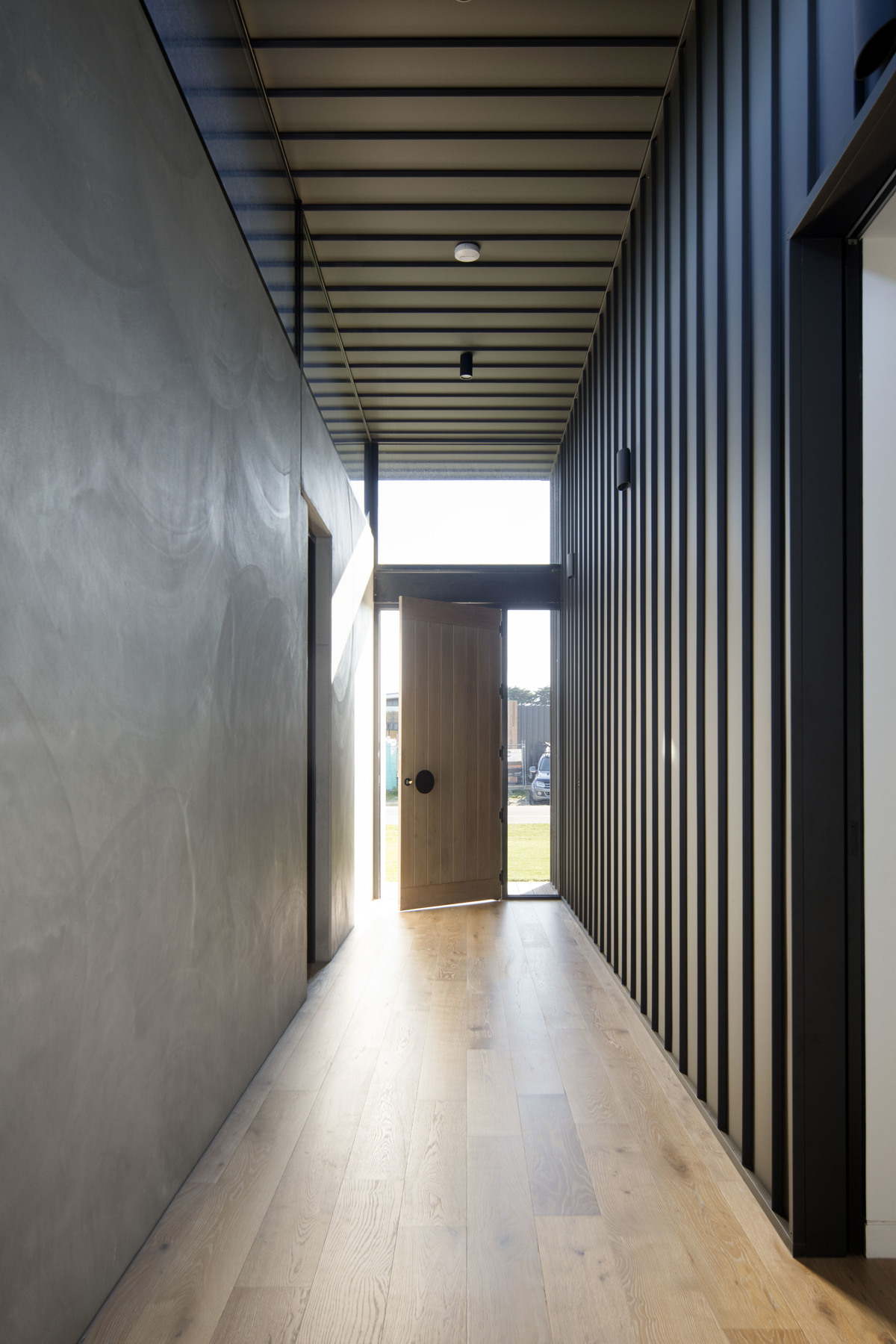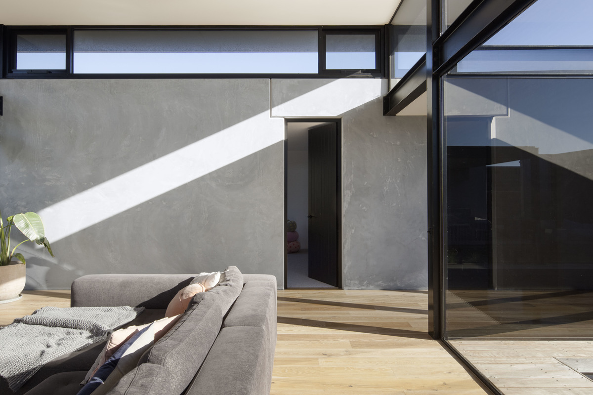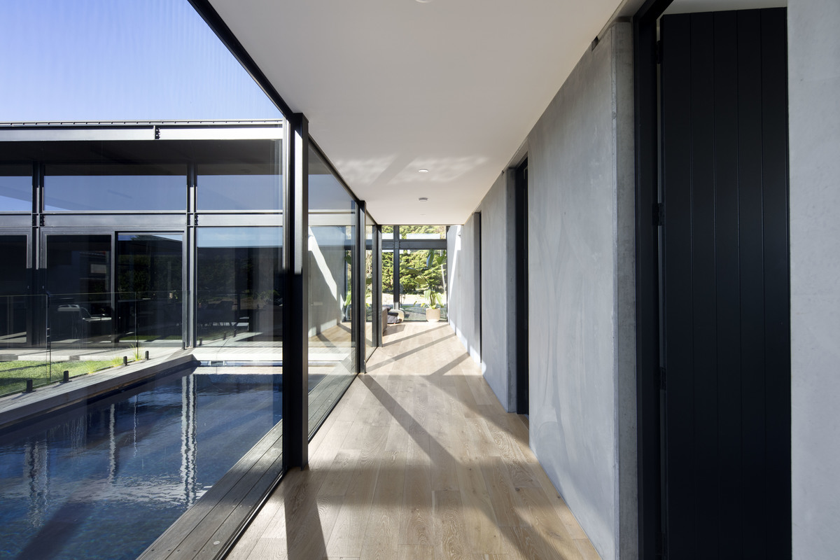 The home is comprised of a simple, paired-back palette with a central spine of precast concrete anchoring the building and creating a mass element to contrast the light-weight, expressed-steel skeleton.