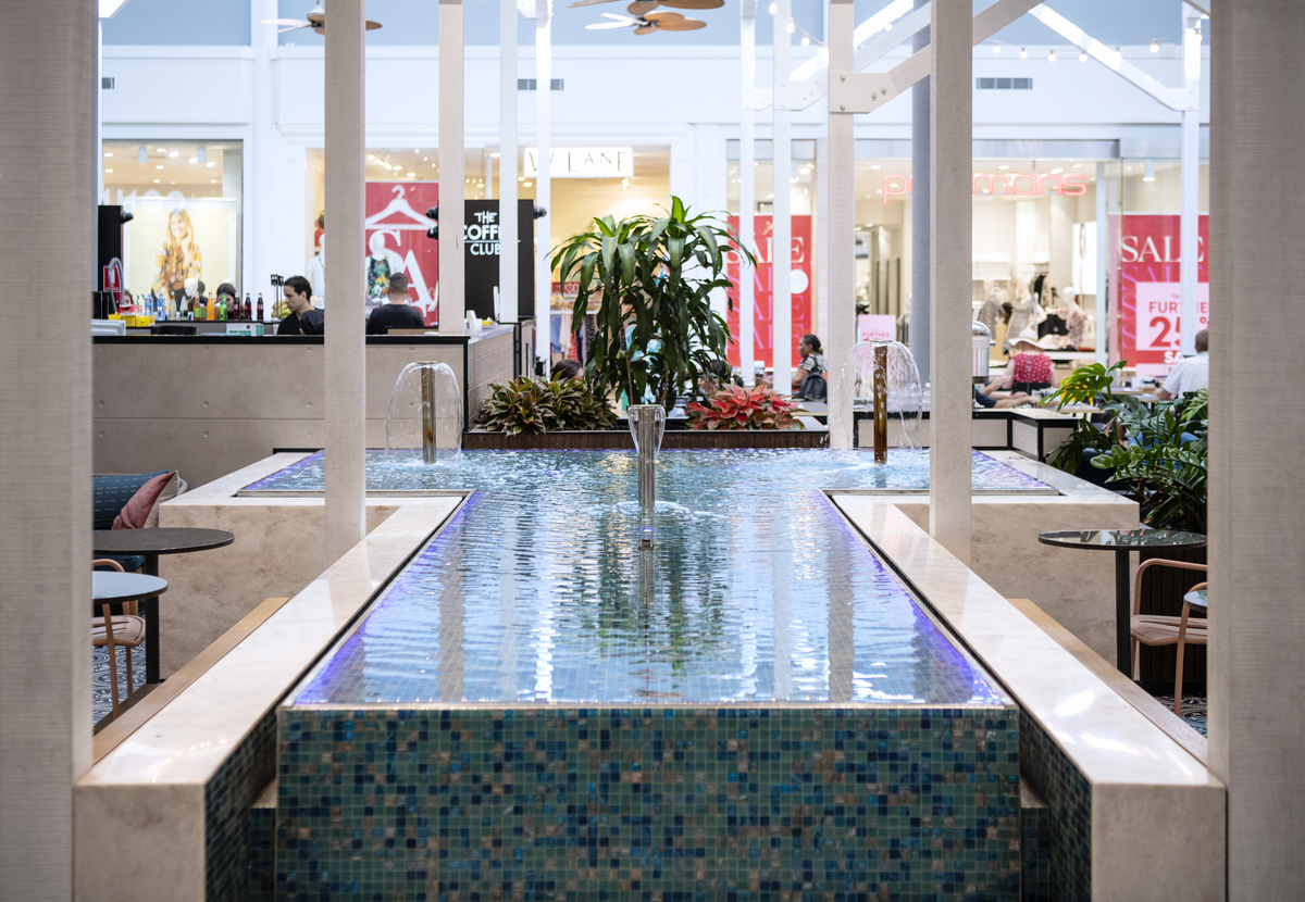 The Resort Node seating and water features provide a luxurious space to pause and enjoy the centre, which is tropical, vibrant and captivating and works to bring light into space.