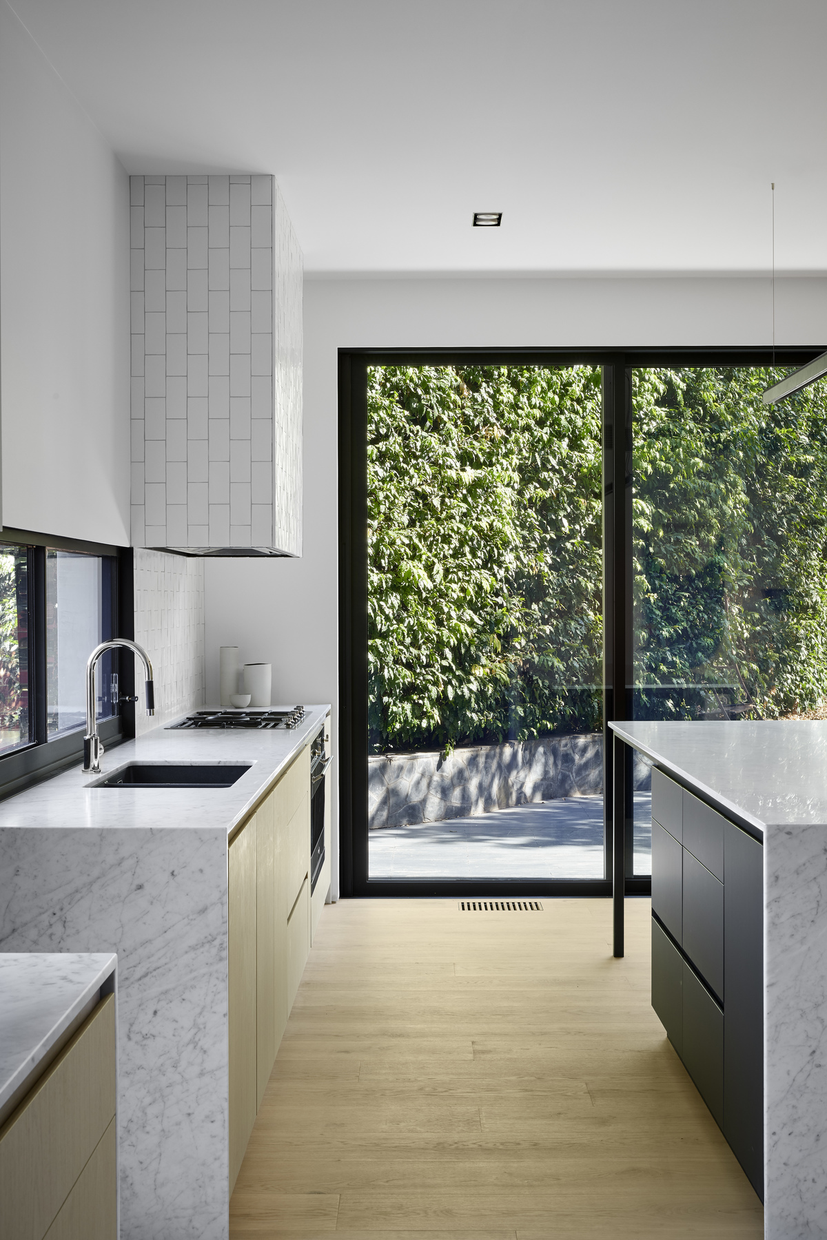 Internal finishes are restrained, with cost effective matte and timber laminates used to offset Carrara marble and hand-made tiles.