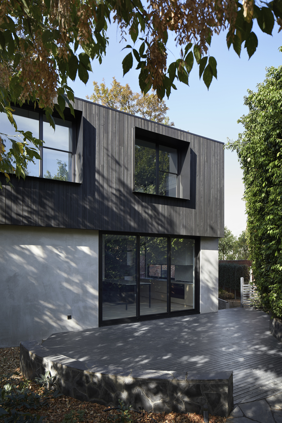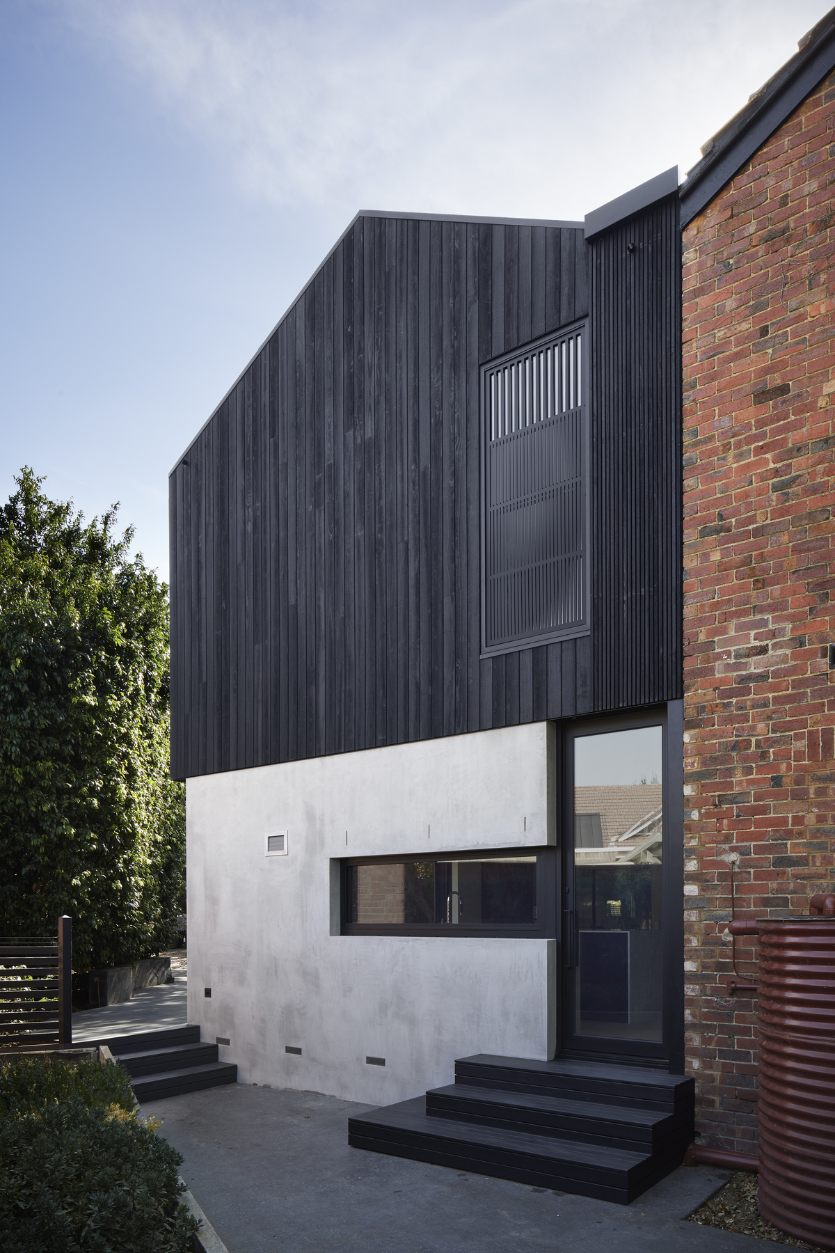 As a counterpoint to the solidity of the clinker brick of the original house, the addition is light weight and clad at the upper floor in charred timber.