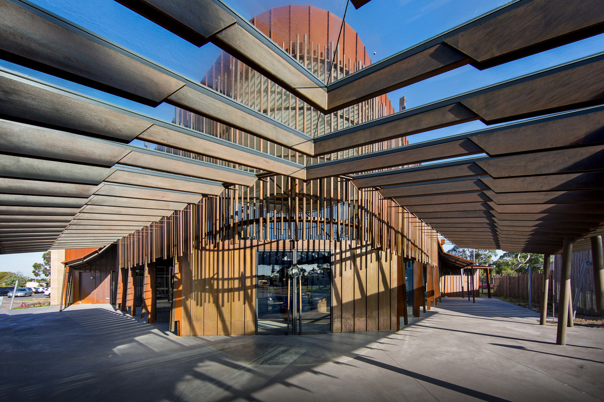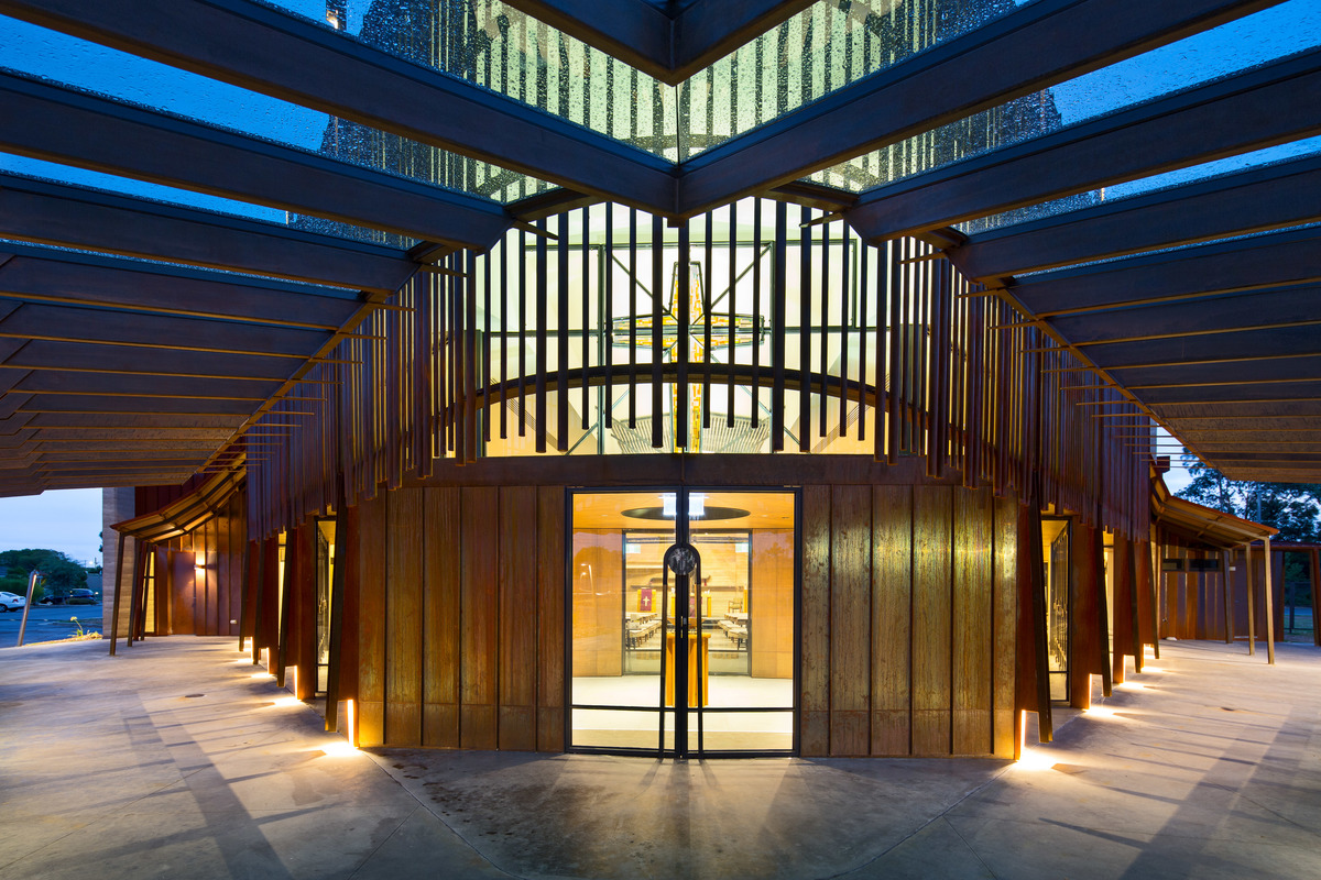 Sustainability is recognized in the building’s low-maintenance cost and thermal stability through the extensive use of rammed earth on the north, south, and west elevations, along with the use of Coreten cladding.