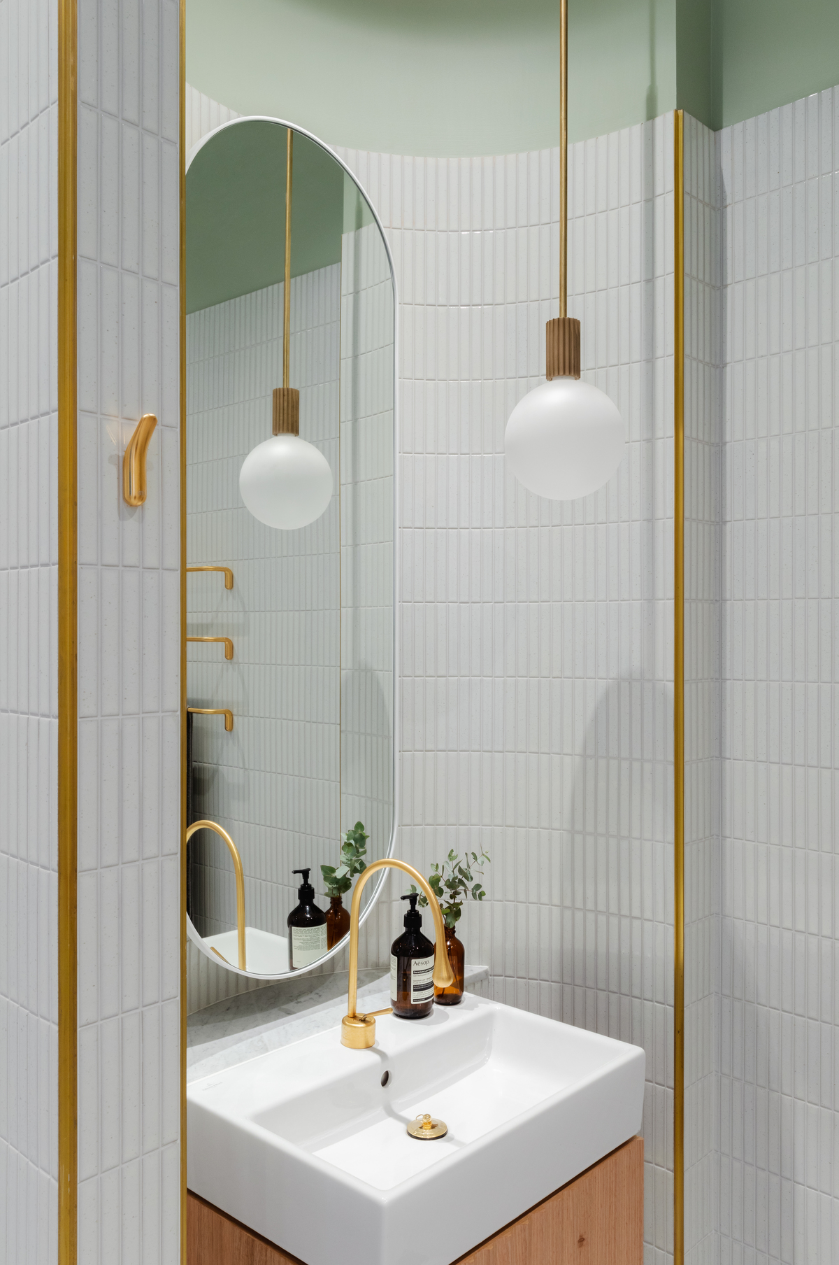 A former bedroom is now the main bathroom containing a hidden laundry. The individual functions of the space – toilet, basin, and shower – have been subdivided into micro-spaces by the use of curved tiling.