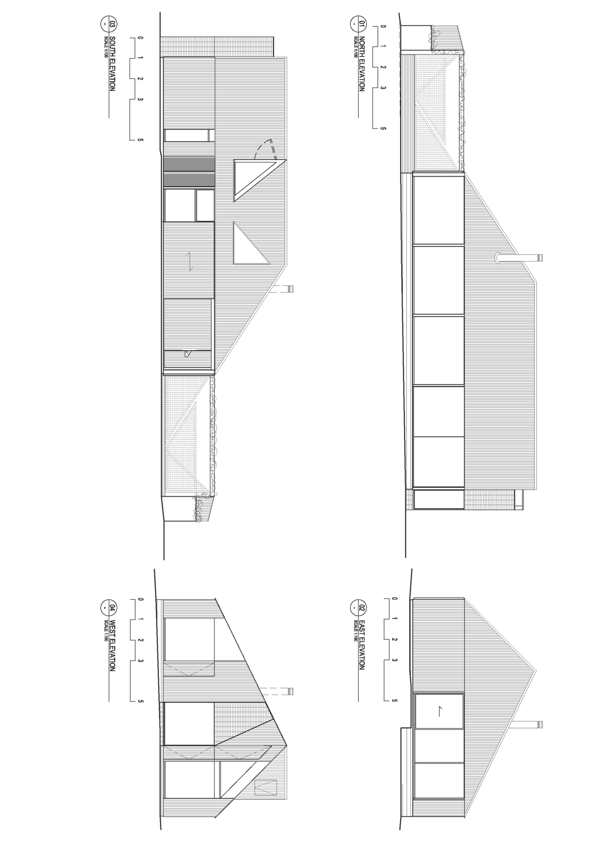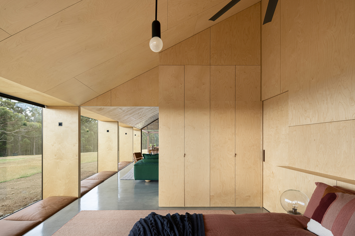 Internally, the contrast of lofty volumes and snug spaces are accentuated by a utilitarian palette of plywood linings and concrete floors.