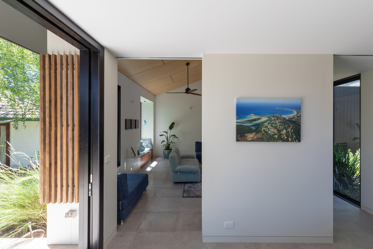 A highlight is the hoop pine plywood raked ceilings to living areas and bedrooms, providing a warm glow to an otherwise neutral palette.
