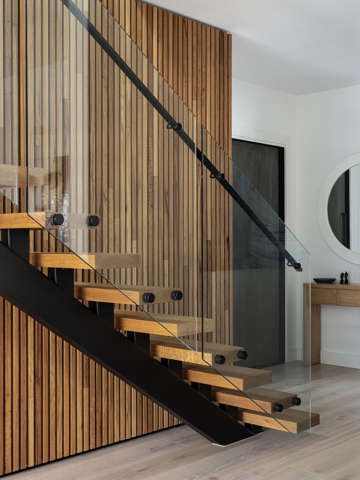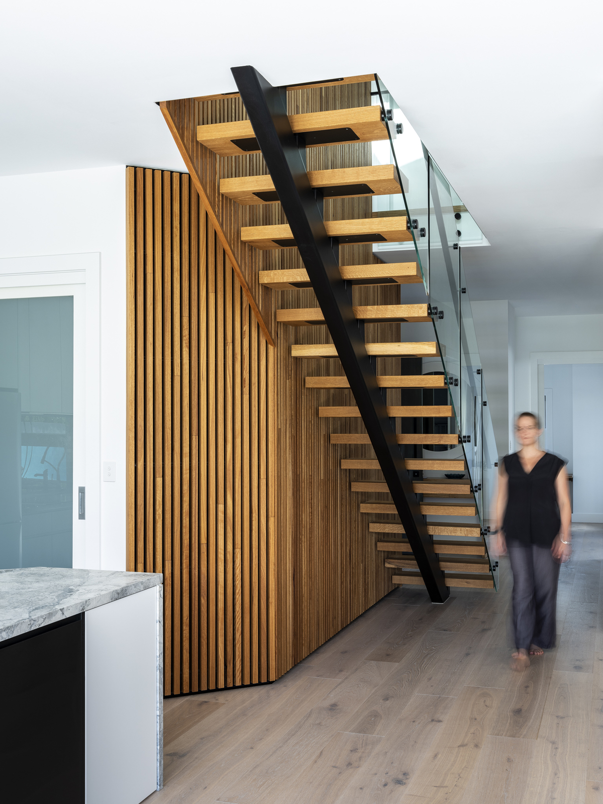 By completely re-imagining the existing stairwell, the dwelling interior was transformed, with a new cantilevering stair and timber feature wall drawing natural light deep into the house.