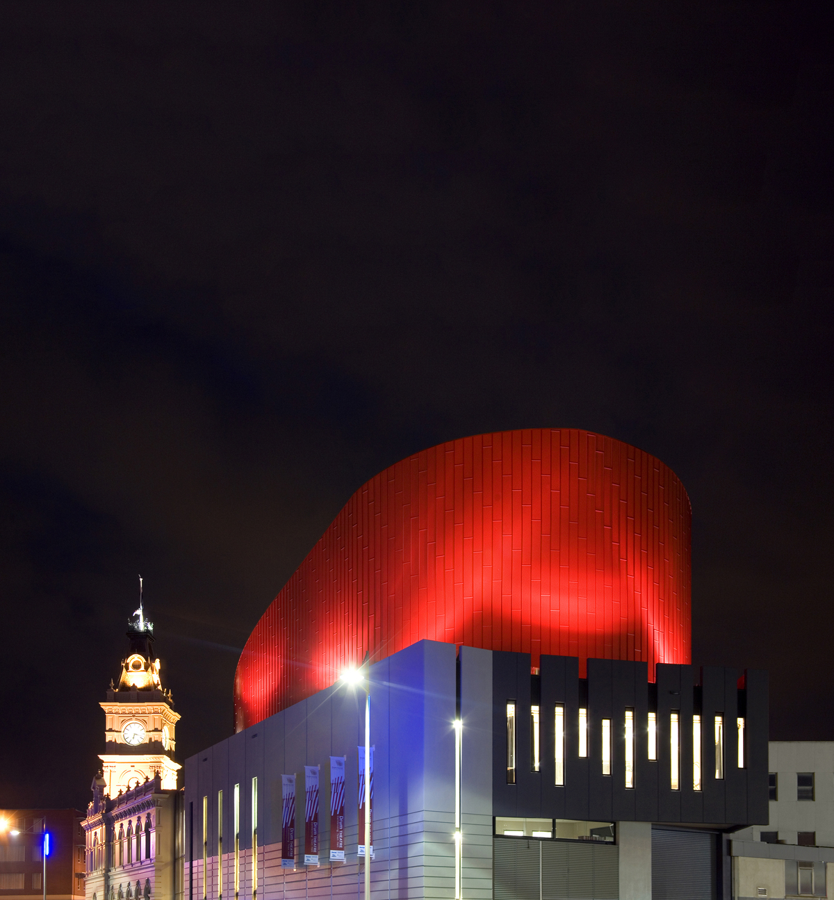 Expressed as a dramatic, modern “drum”, the theatre envelops the auditorium, foyer amenities, and fly-tower as a single, strongly coloured form.