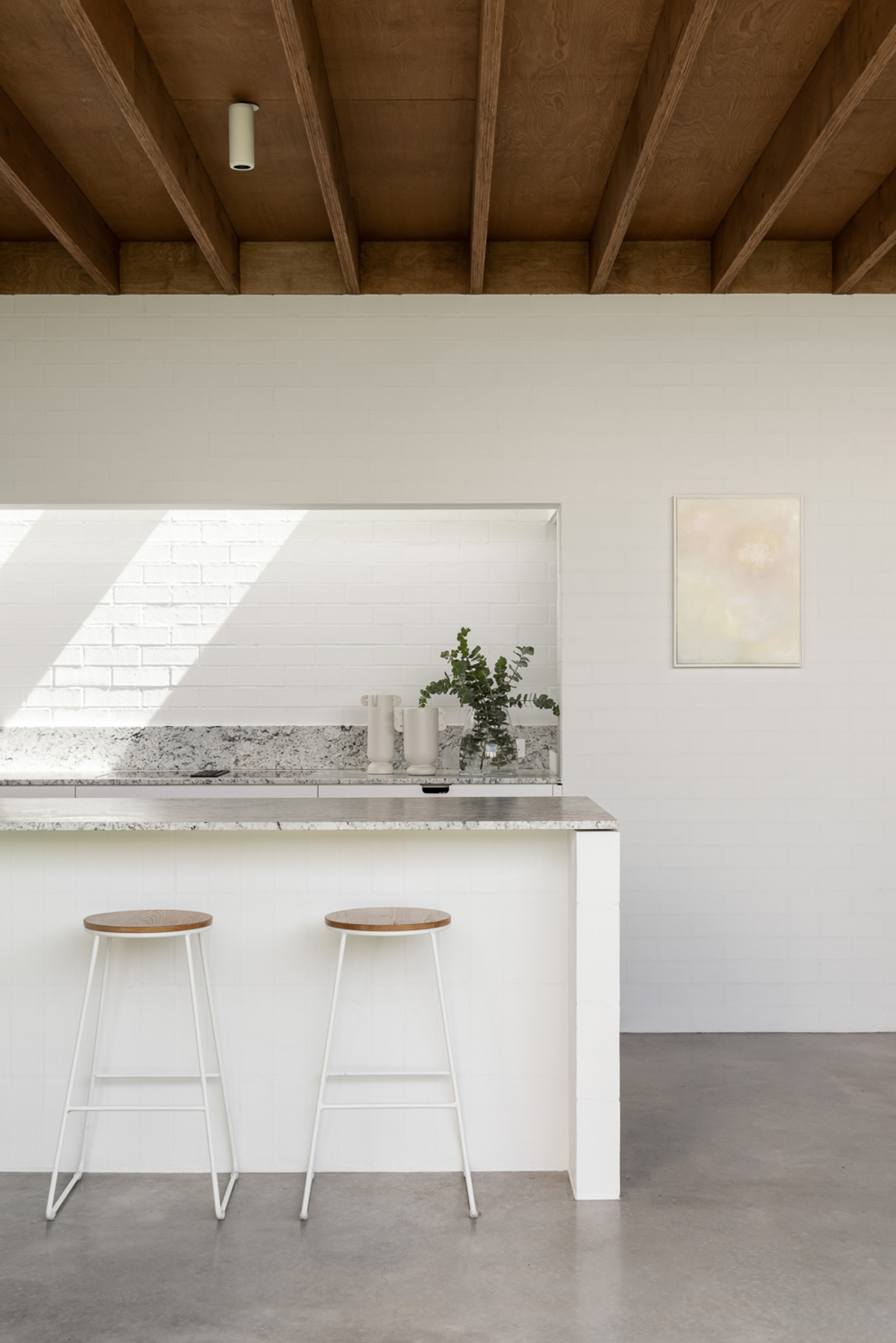 There are two points where this hard datum threshold is broken; once on the southern elevation where the counter ‘lumps’ break through to varying heights, and again in the sunken lounge room where the first-floor stair flicks a timber hatch down to welcome and gently touch the heavy base of the ground floor program.
