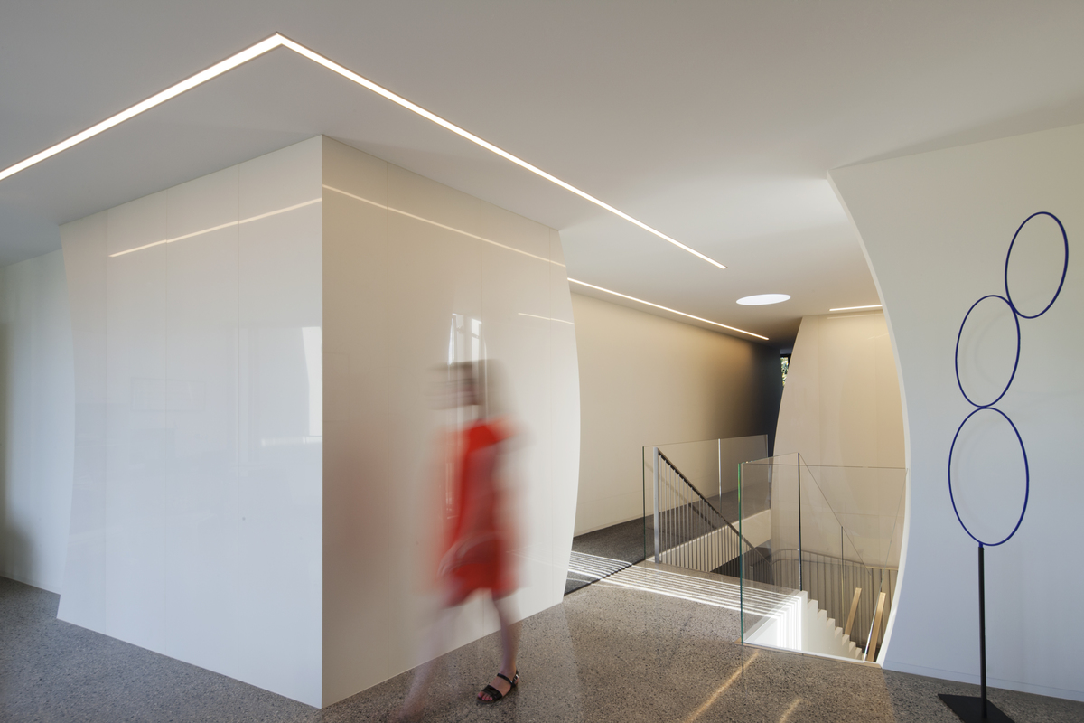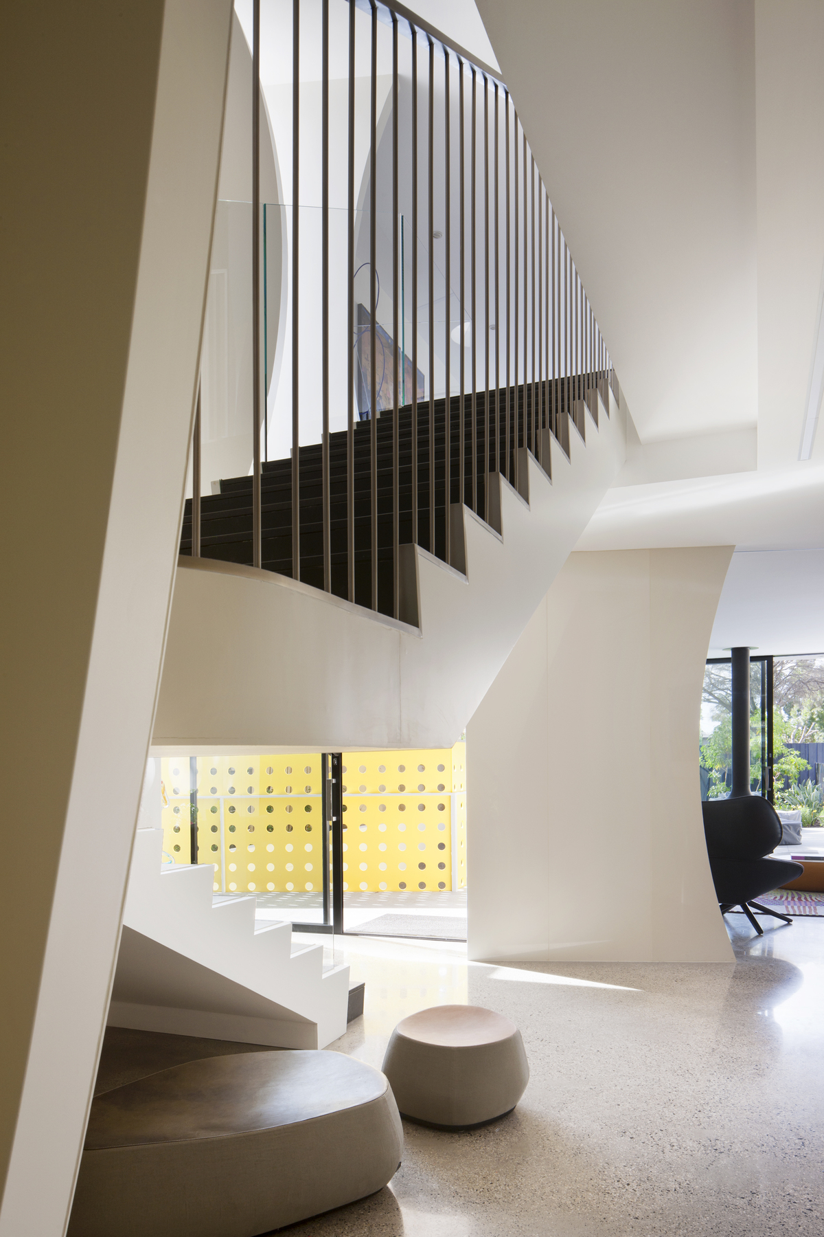 Elliptical-shaped walls set up sight lines that create new spatial perspectives, as does the controlled use of colour in the home, both inside and out.