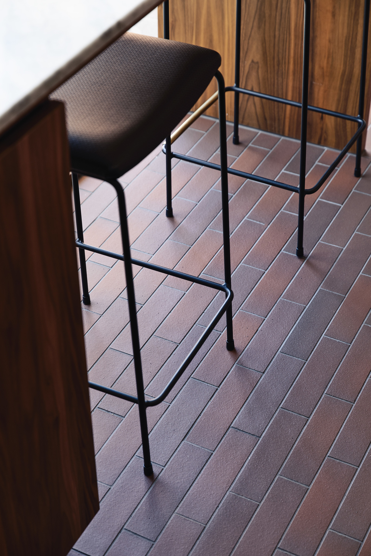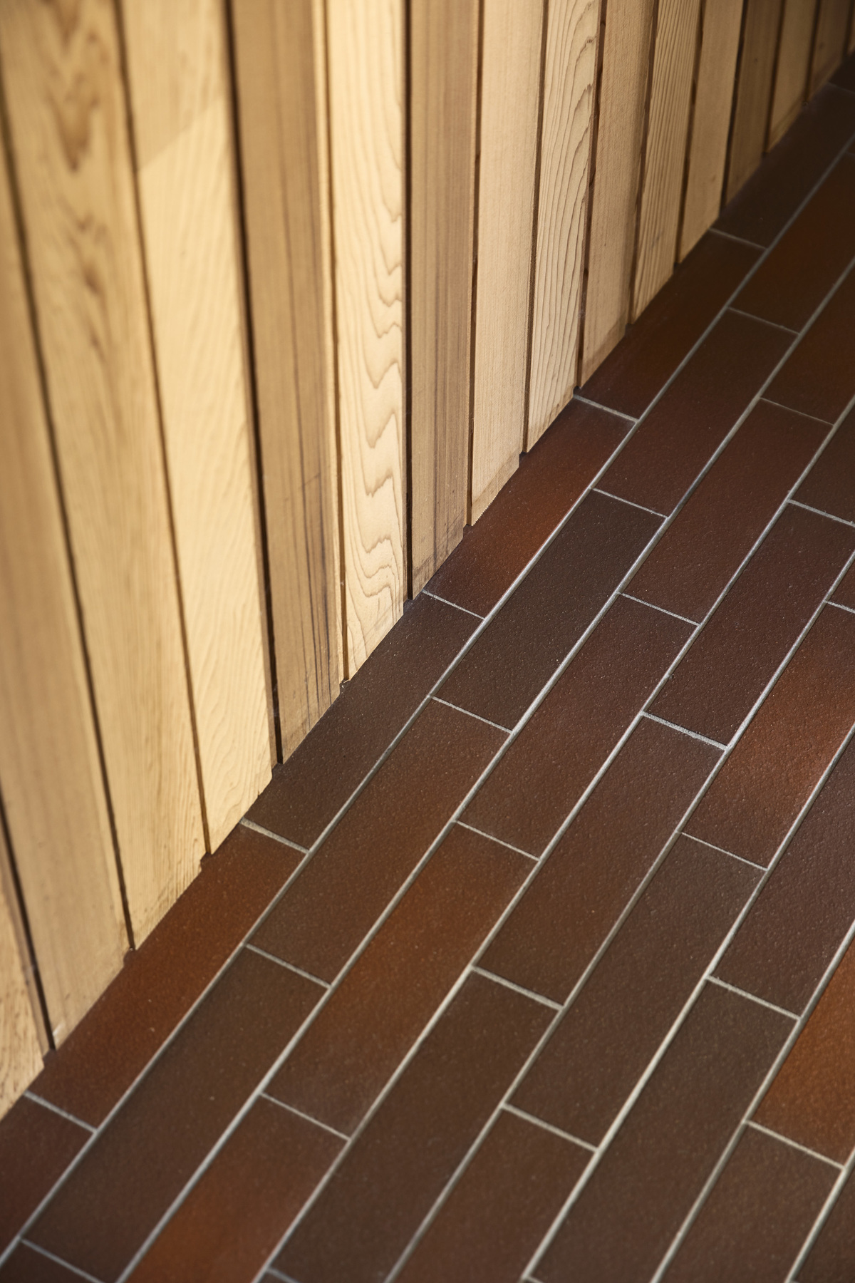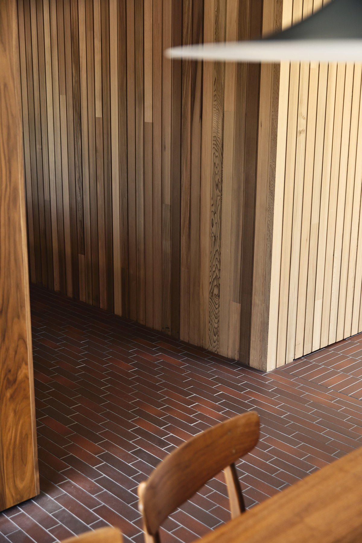 The natural clay fired clay tiles, American walnut veneer, and cedar lining boards were selected for their nostalgic connection to the period.