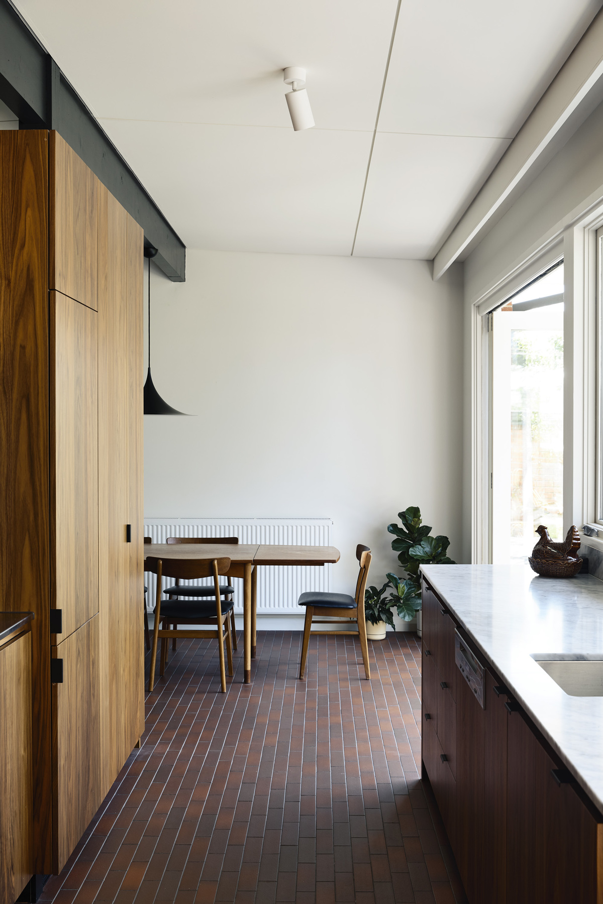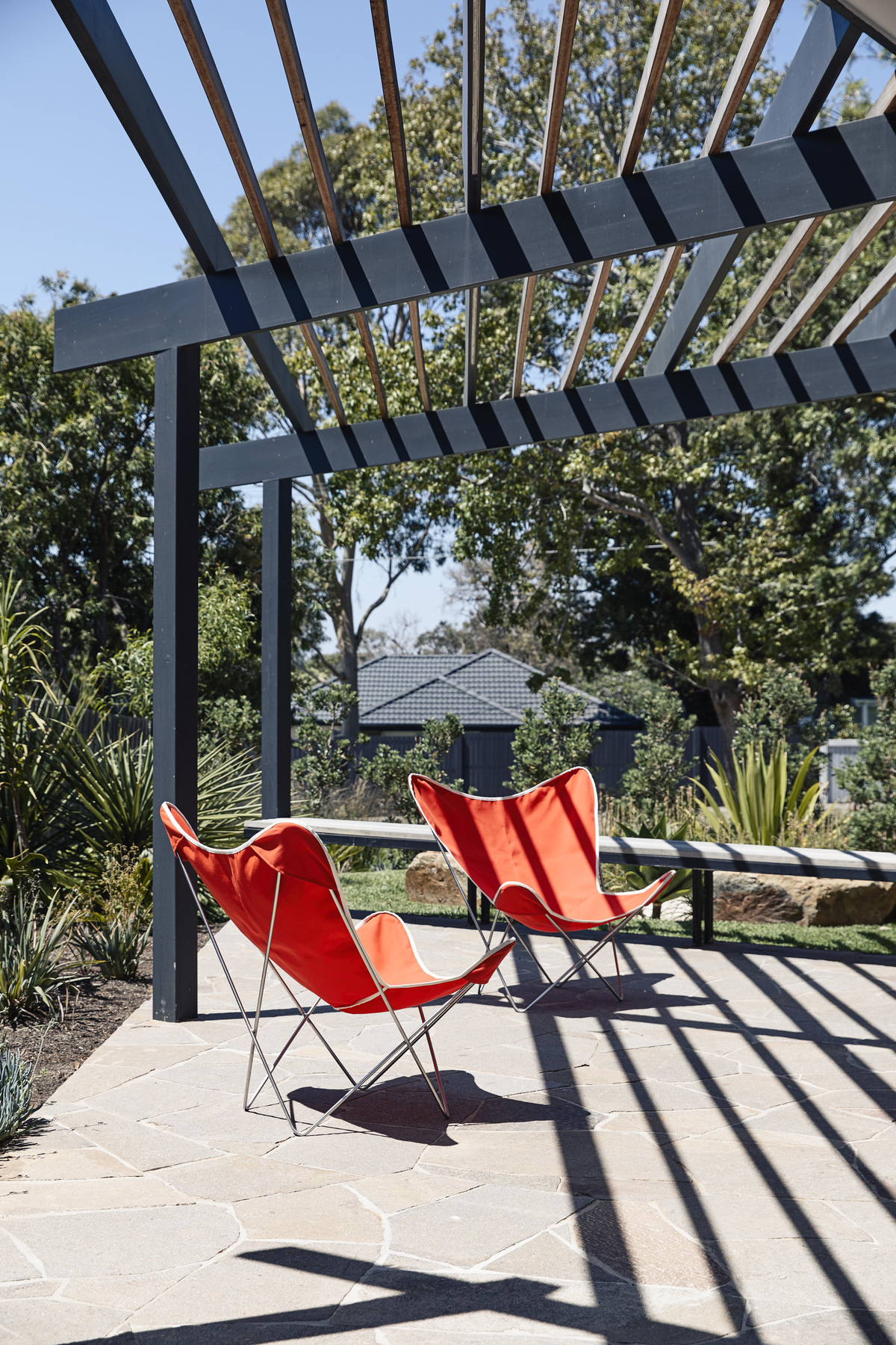 The kitchen and dining spaces were recreated and connected to a new outdoor terrace with pergola over.
