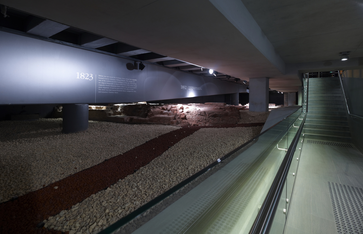 They were not fully revealed until the existing site buildings were demolished, and once exposed the footings were preserved and revealed to the public in the basement and interpreted on the ground floor of the foyer.