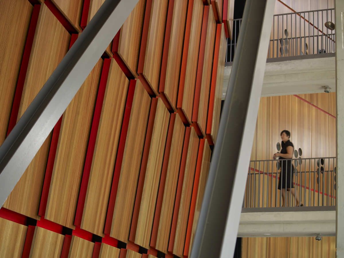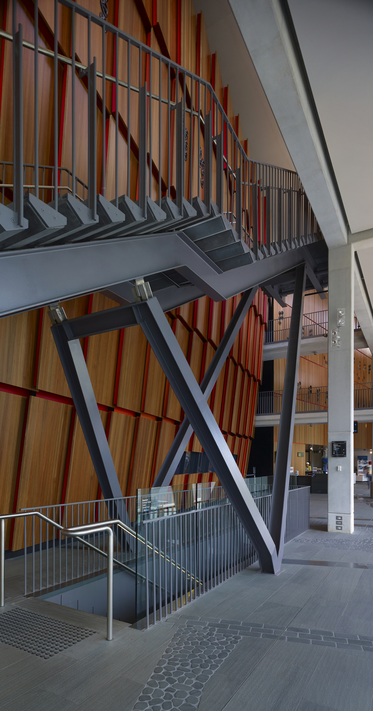 Wrapped around the sculpted form of the tall auditorium, the foyers are open and glassy, and are naturally ventilated.