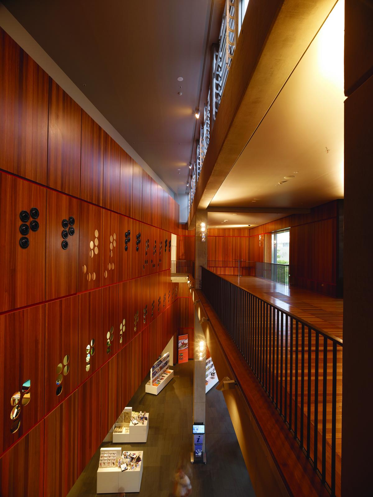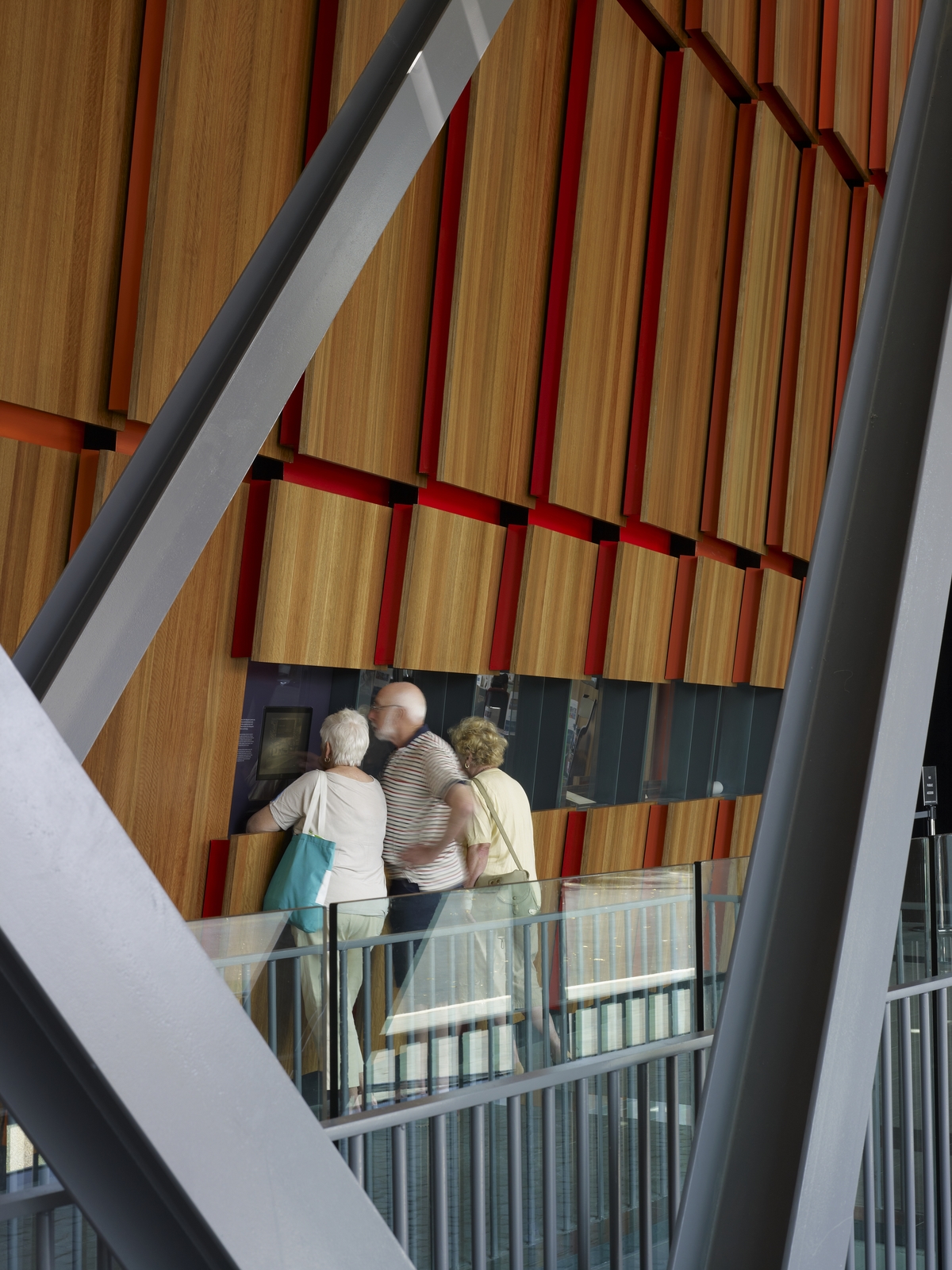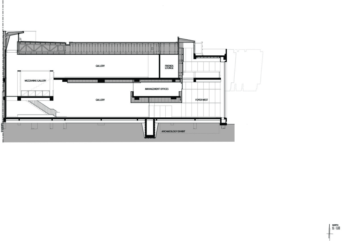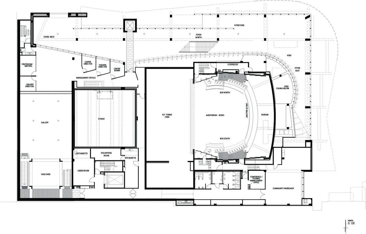 The gallery is located to share the foyer space of the theatre, allowing appropriate exhibitions to fill the public spaces of the building and, in low-visitation days, the centre to be operated with minimal staff.