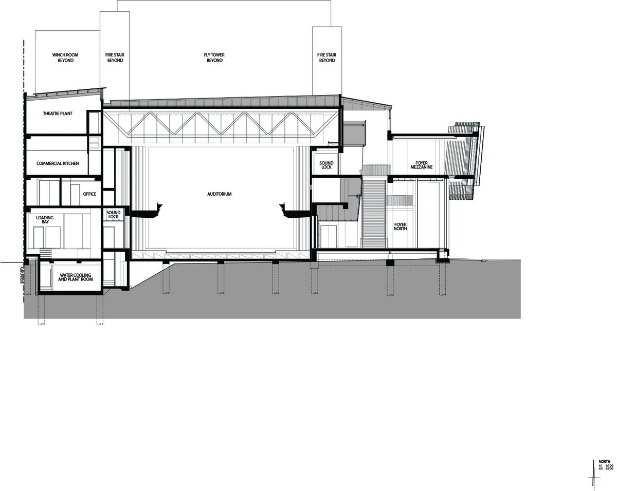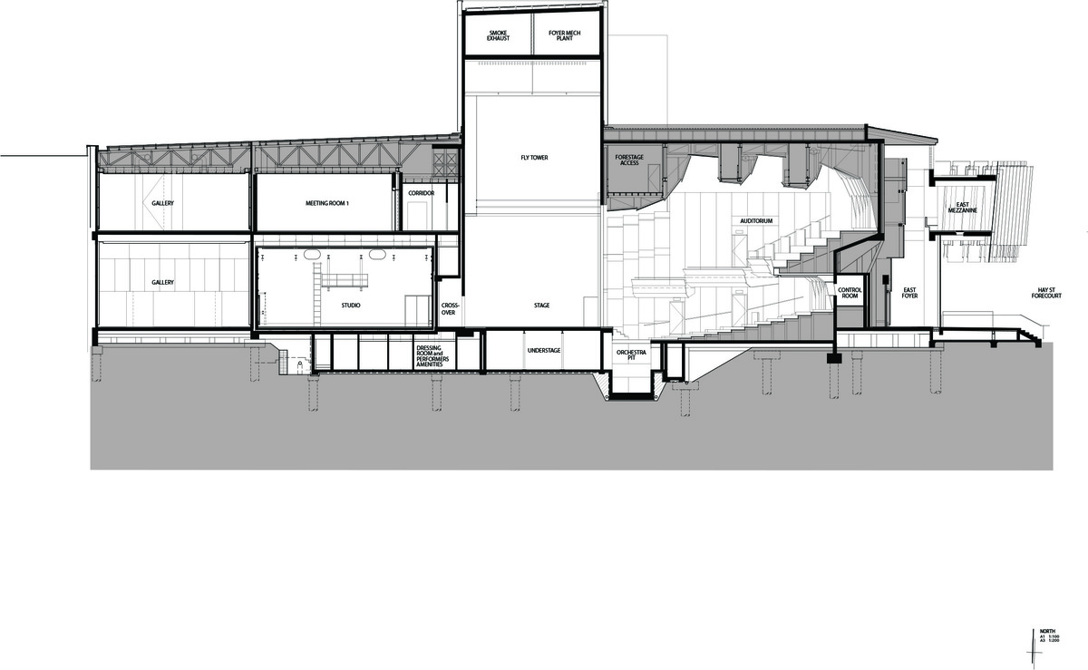 The foyer and building expression is generated by the contrasting orders of the city grid and the voluminous form of the theatre shell, with its level 3 echo, the glass ‘skirt’ cantilevering over Clarence Street.