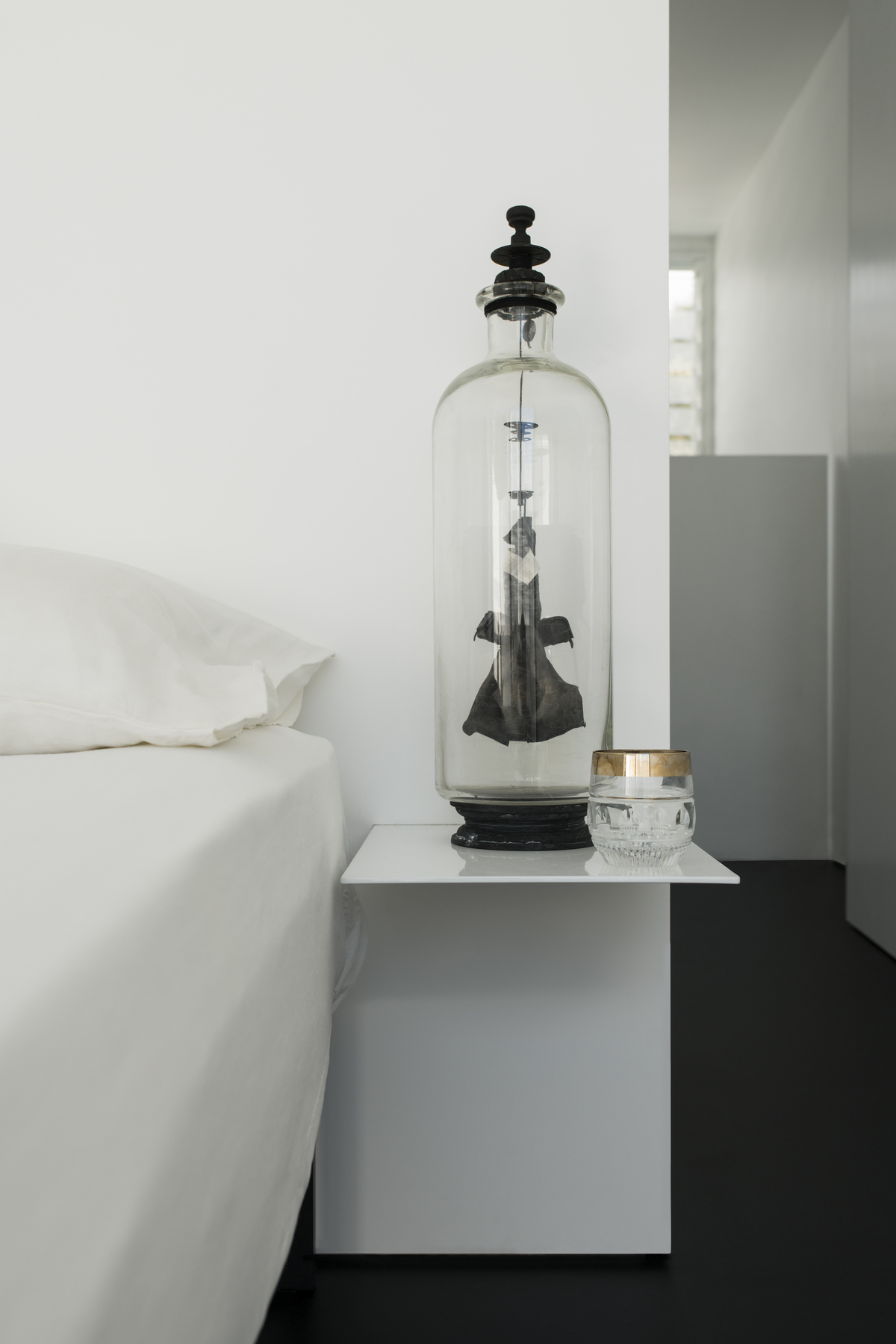 A freestanding wardrobe unit forms the bedhead, with the ensuite to the rear beside the new stair.