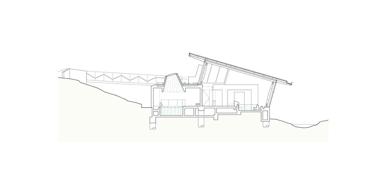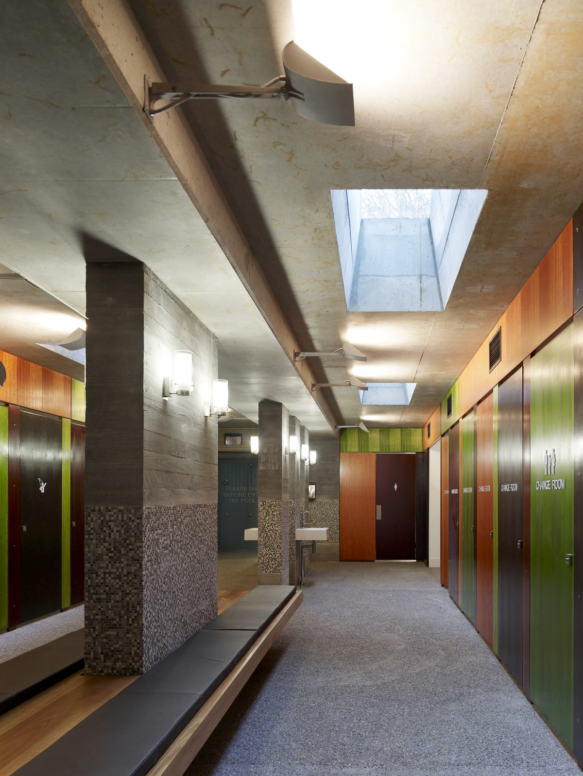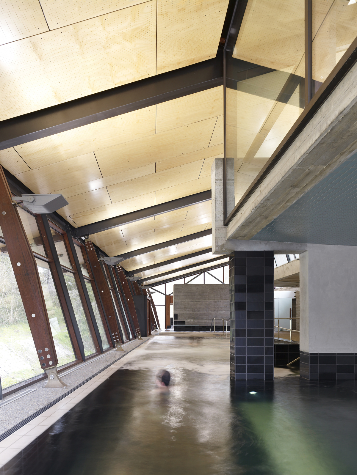 The northern pavilion is a striking single-storey structure containing the main public bathing pools as well as change facilities at creek level and reception above.