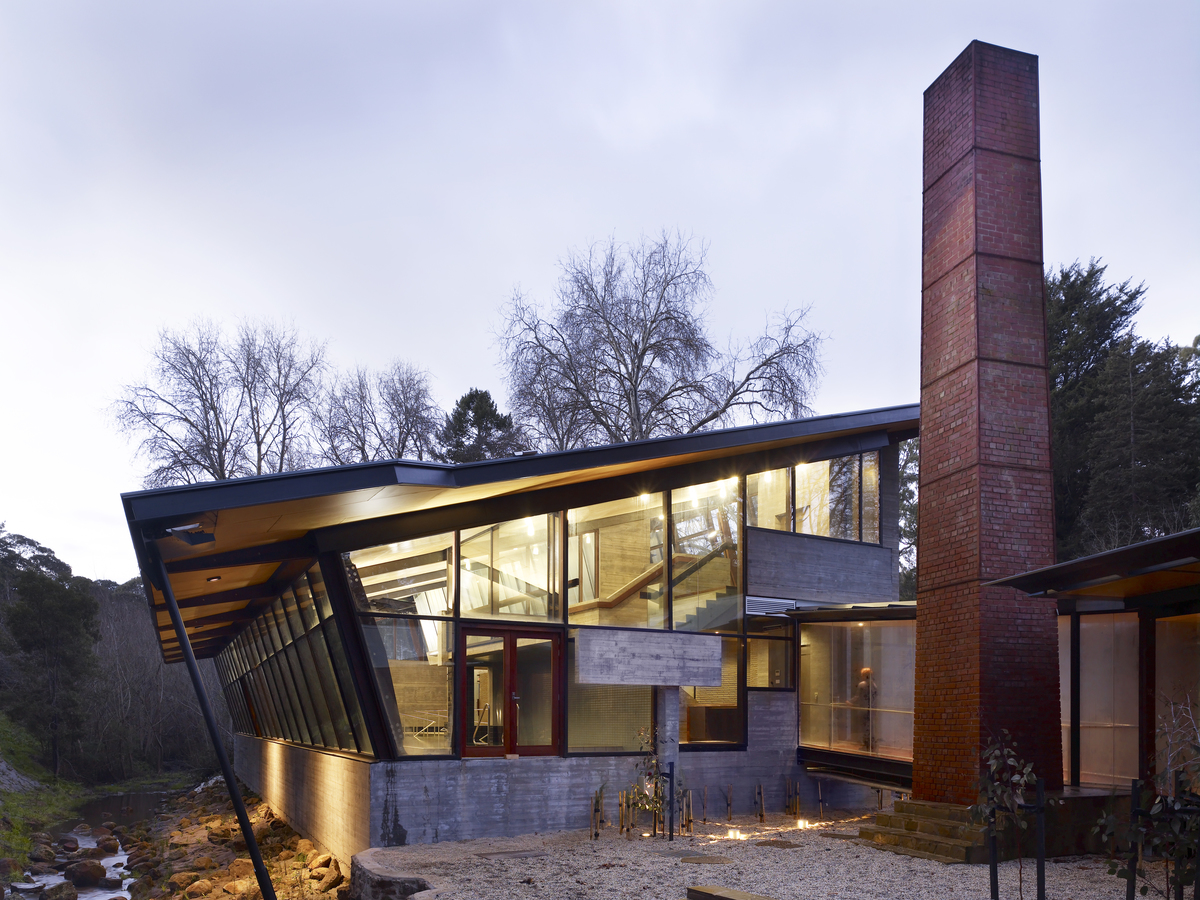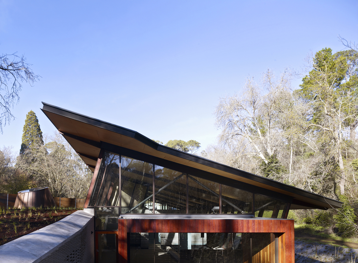 Grass-roofed with distinctive protruding skylight elements, the building nestles gently into the surrounding creek gully.