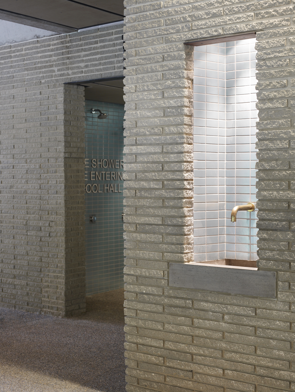 Cast concrete, exposed aggregate and split face brick are reflective of the context within which the bathhouse exists, while a series of internal pools are presented vessels or voids carved from the rock escarpment on which the facility is sited.