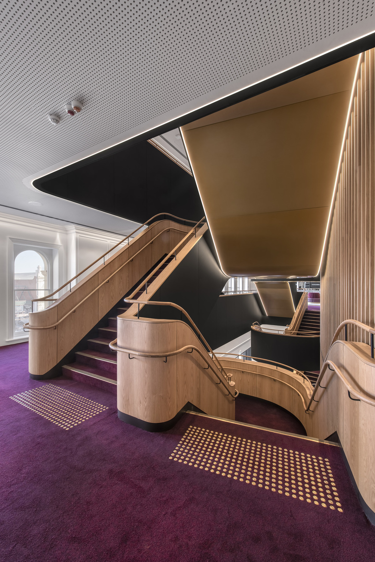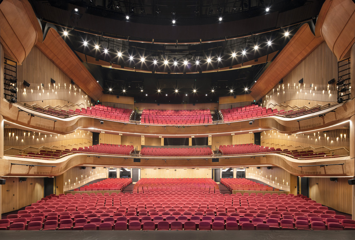 Faceted timber surfaces, including some complex curves, take centre stage within the architecture to create a sense of excitement and expectation pre-performance.