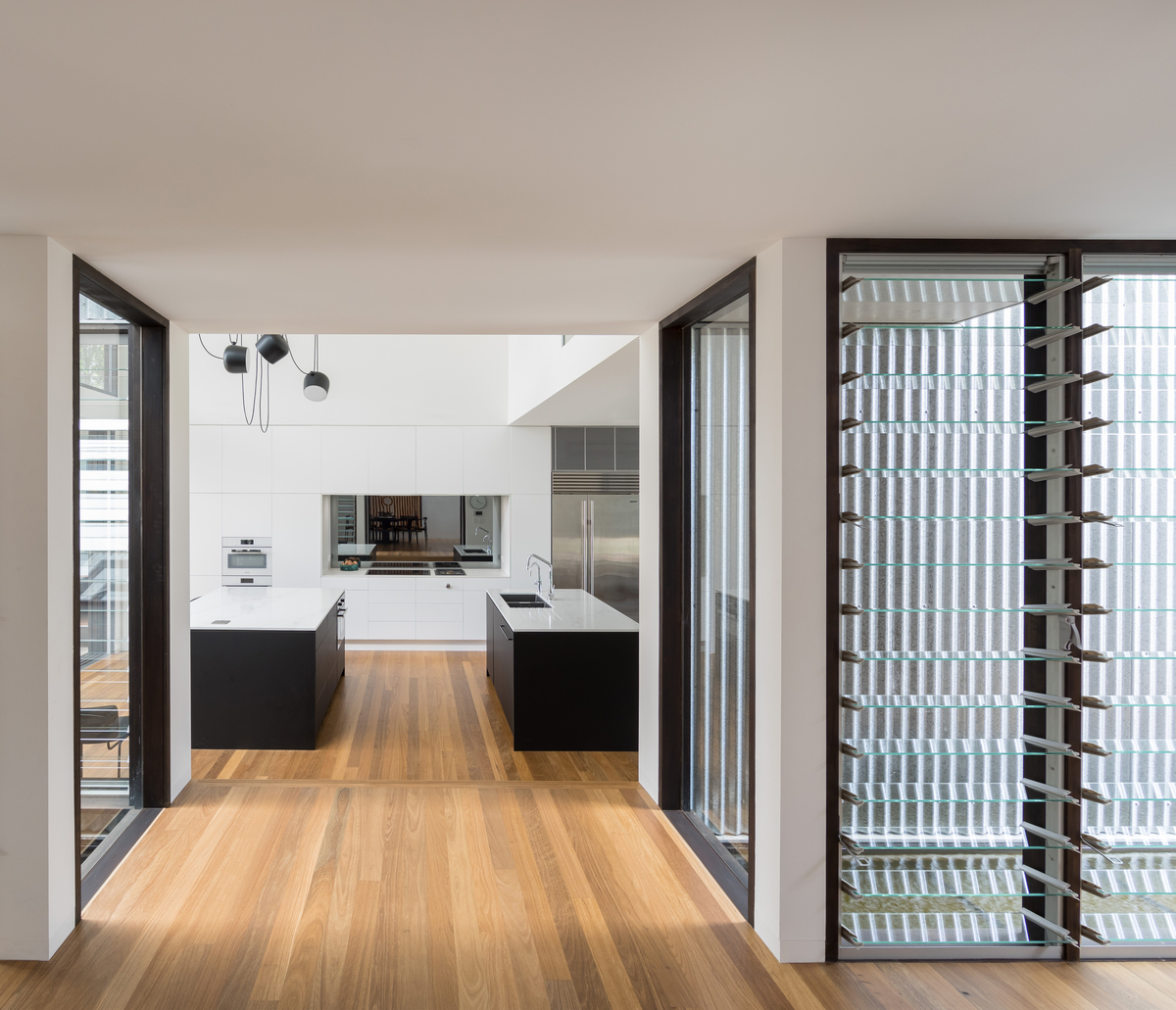 A compressed entry, with views through the centre of the site onto both gardens and water, opens onto the double height kitchen space.