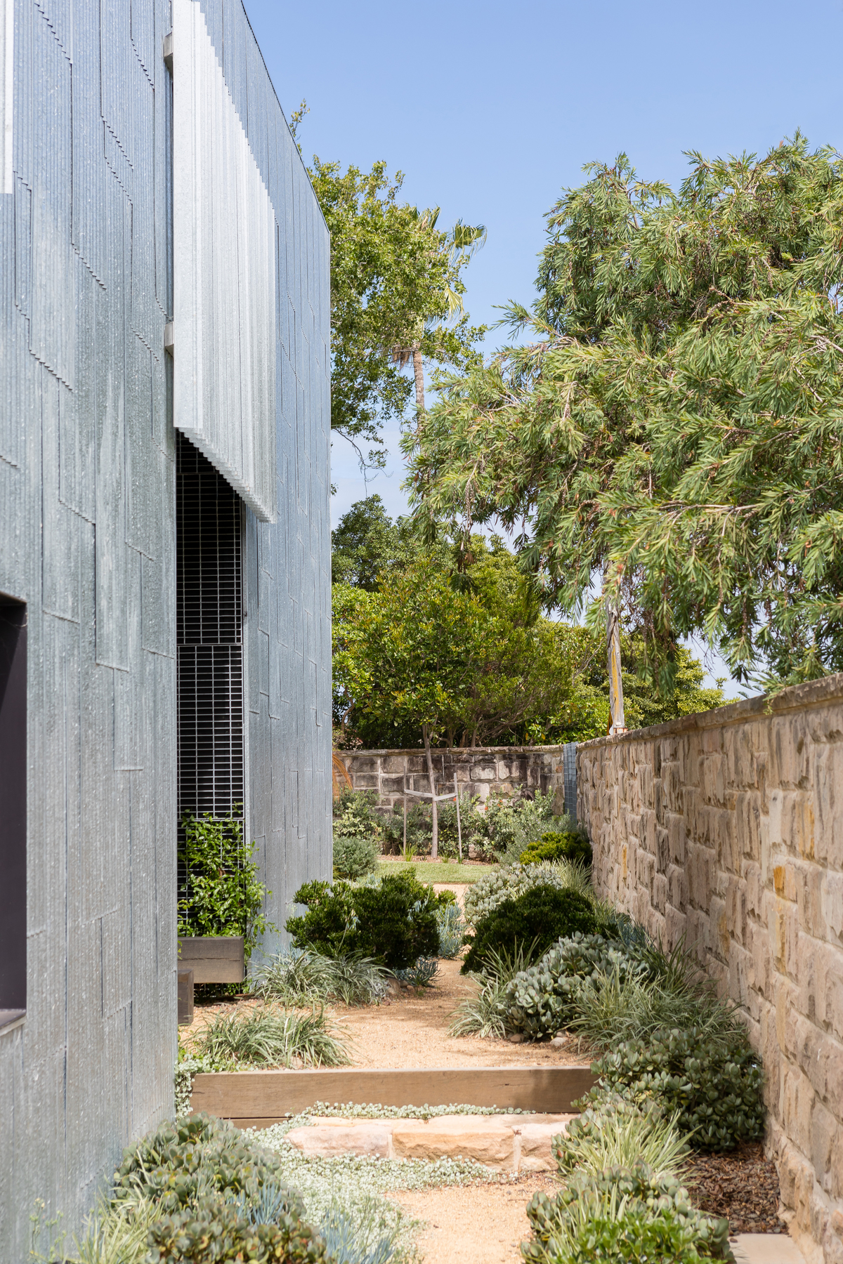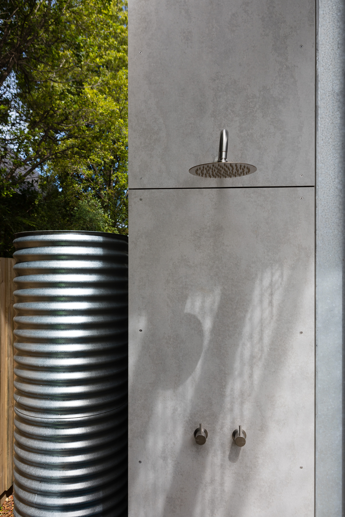 Activity at the ground level and over-looking into the intimate spaces of the home are protected by horizontal timber and corrugated iron cladding.