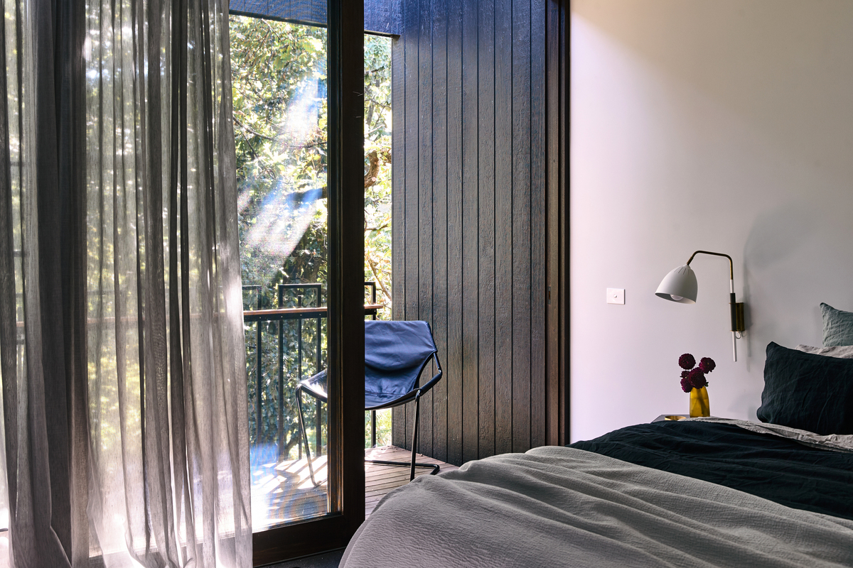 The design screens out adjoining neighbours, giving northern aspect to living spaces and focusing views into the treetops.