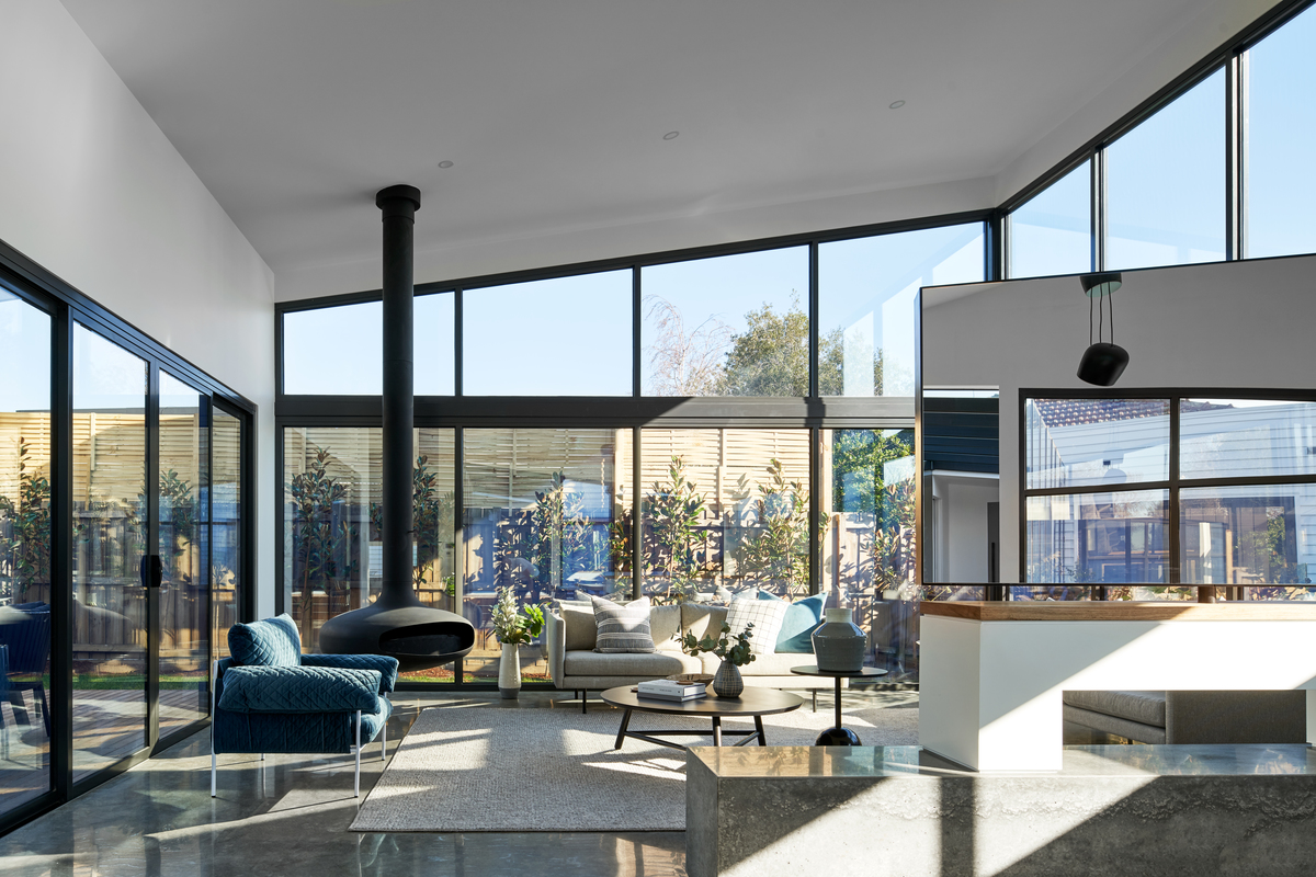 The feature concrete floor captures the eye with its industrial vibe and facilitates a passive heating and cooling system; it warms up under direct sunlight during the day, only to slowly emit the heat in the colder Melbourne evenings.