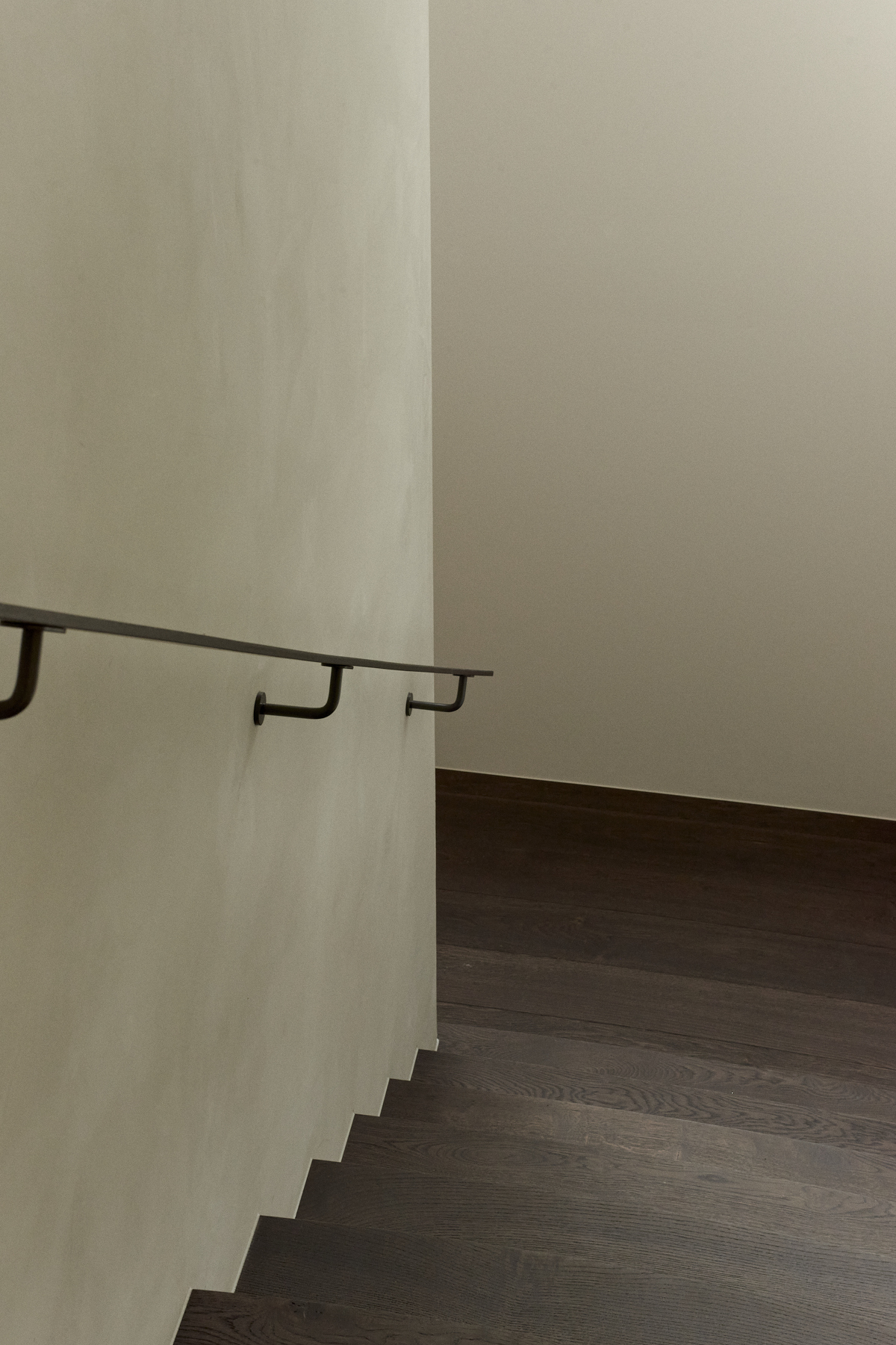 Upon entry, an angular sheet of raw steel cuts through heavyset forms to create a sculptural stair balustrade.
