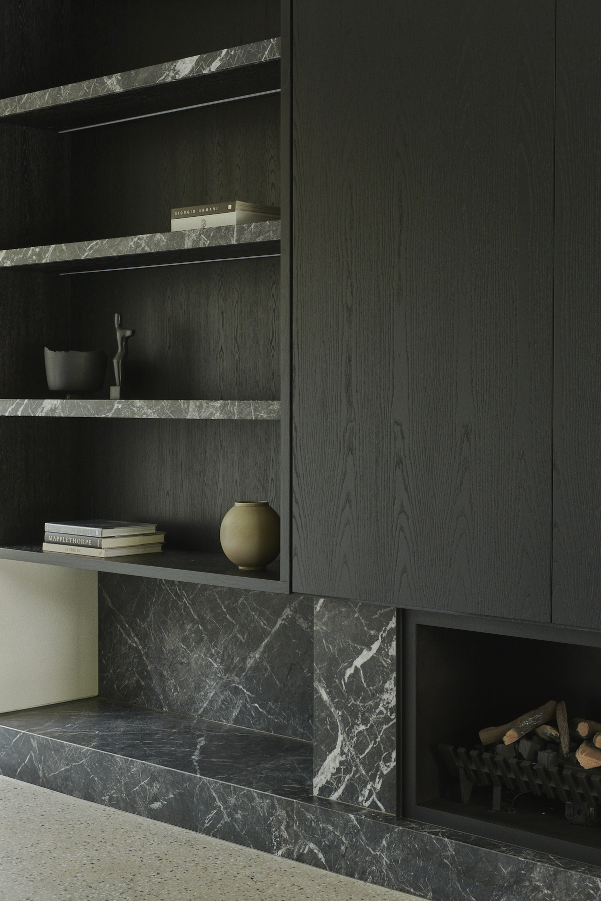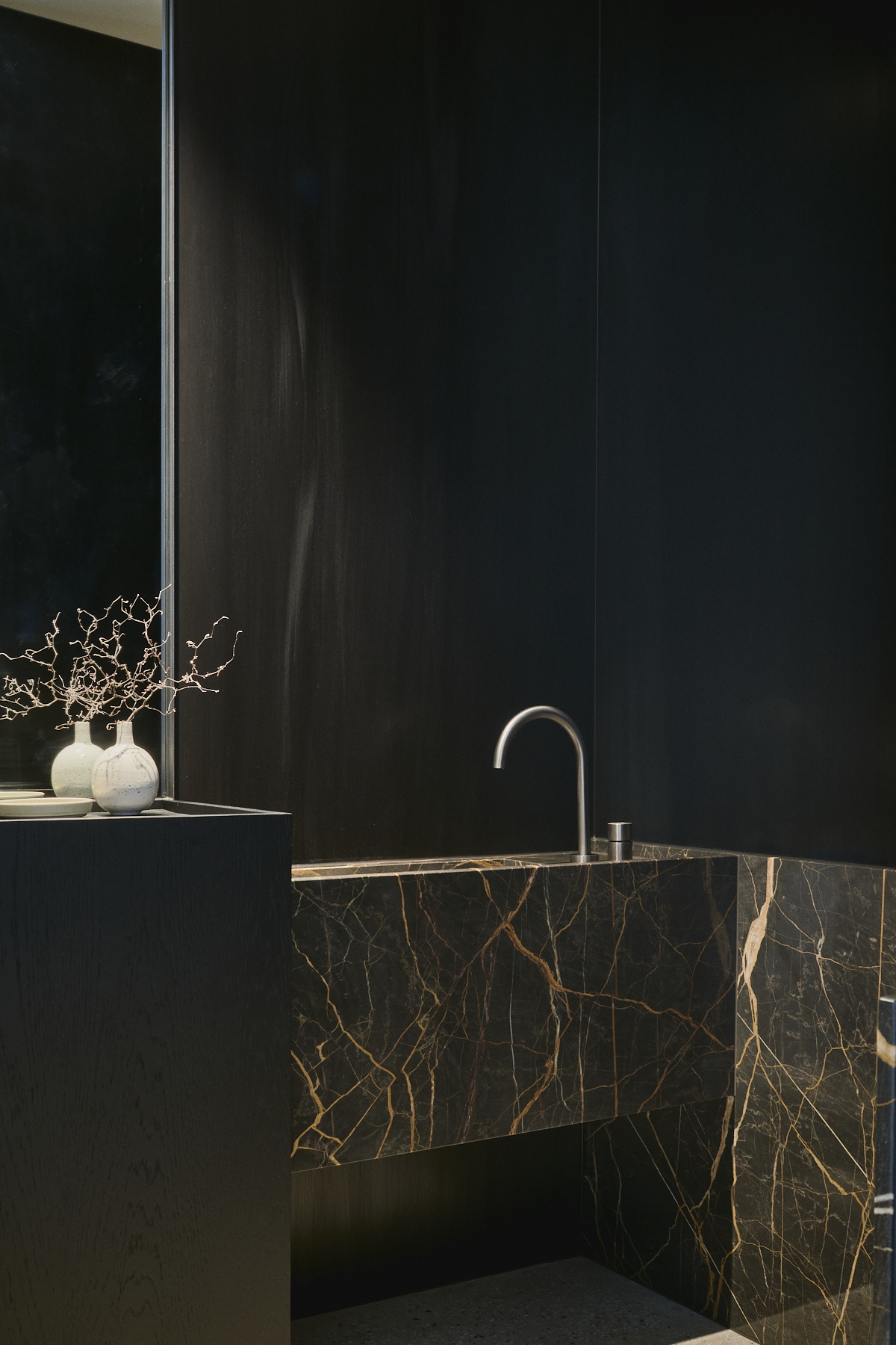 The selection of dark and dramatic natural stone in monolithic forms, dark-toned timbers, and off-white walls creates a timeless palette of materials and an appropriate backdrop for the client’s impressive art collection.