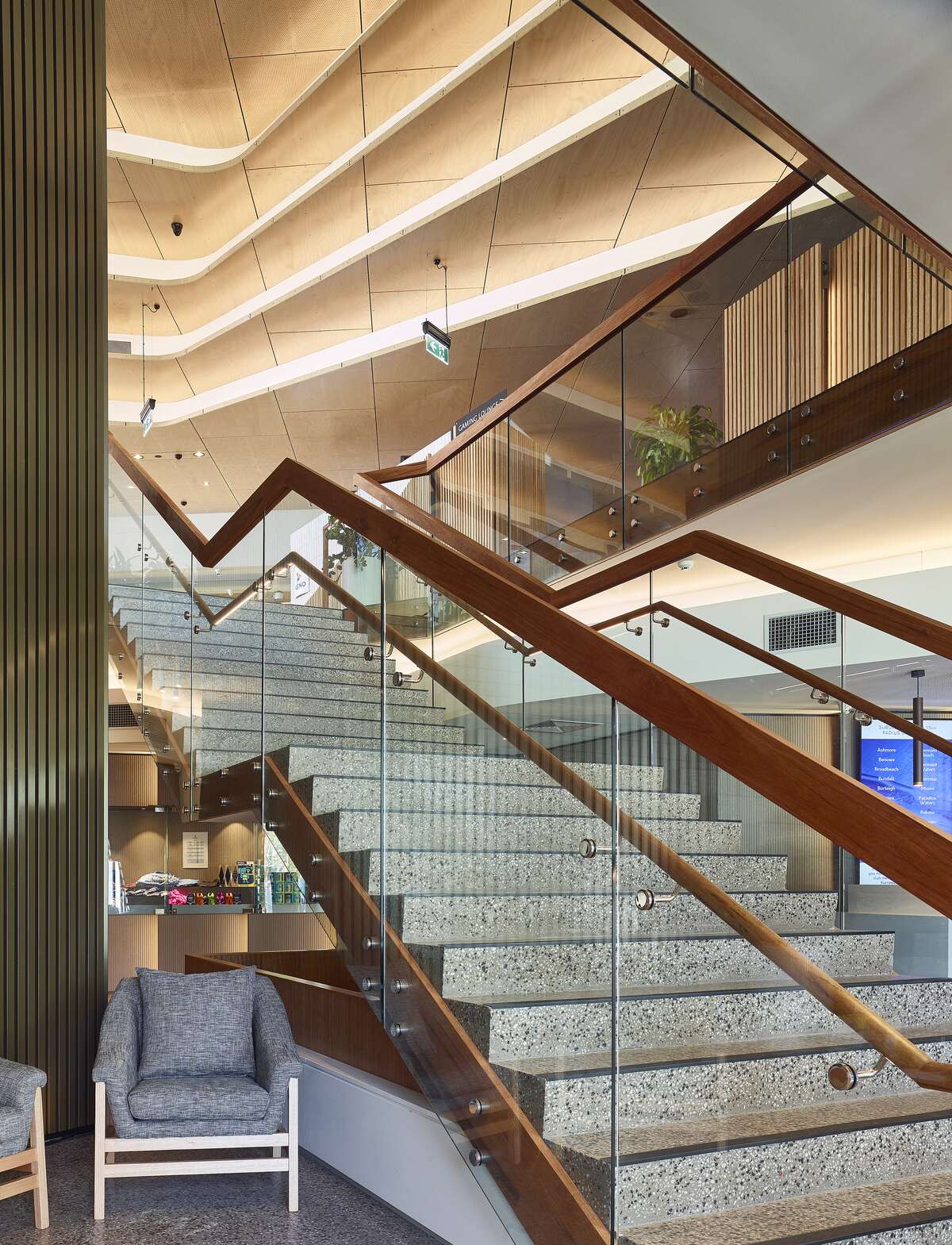 This dual-track objective was achieved via a generous, publicly accessible, and civic scaled, outdoor room as the main focus for the building, a space with a sheltering roof and filtered edges, activated by a café.
